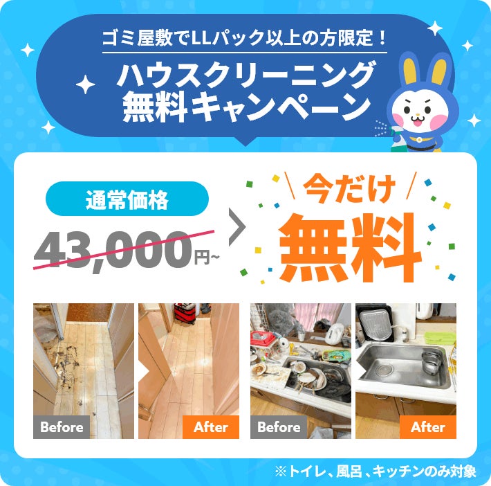 今回のキャンペーンでは、ウェブサイトからゴミ屋敷の片付け(LLパック以上)をご依頼いただいたお客様には、トイレ・風呂・キッチンのハウスクリーニングを無料でご提供いたします。
