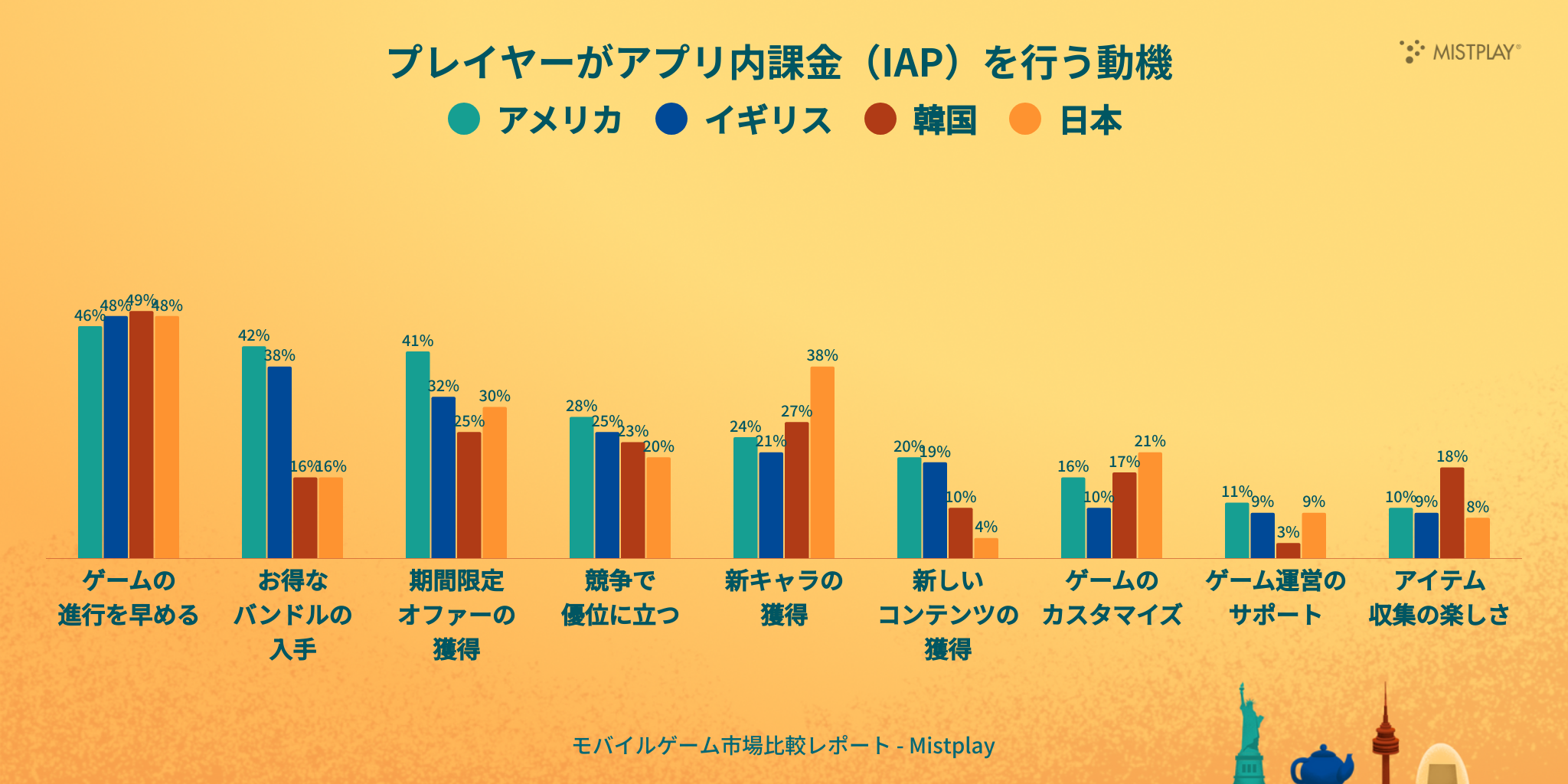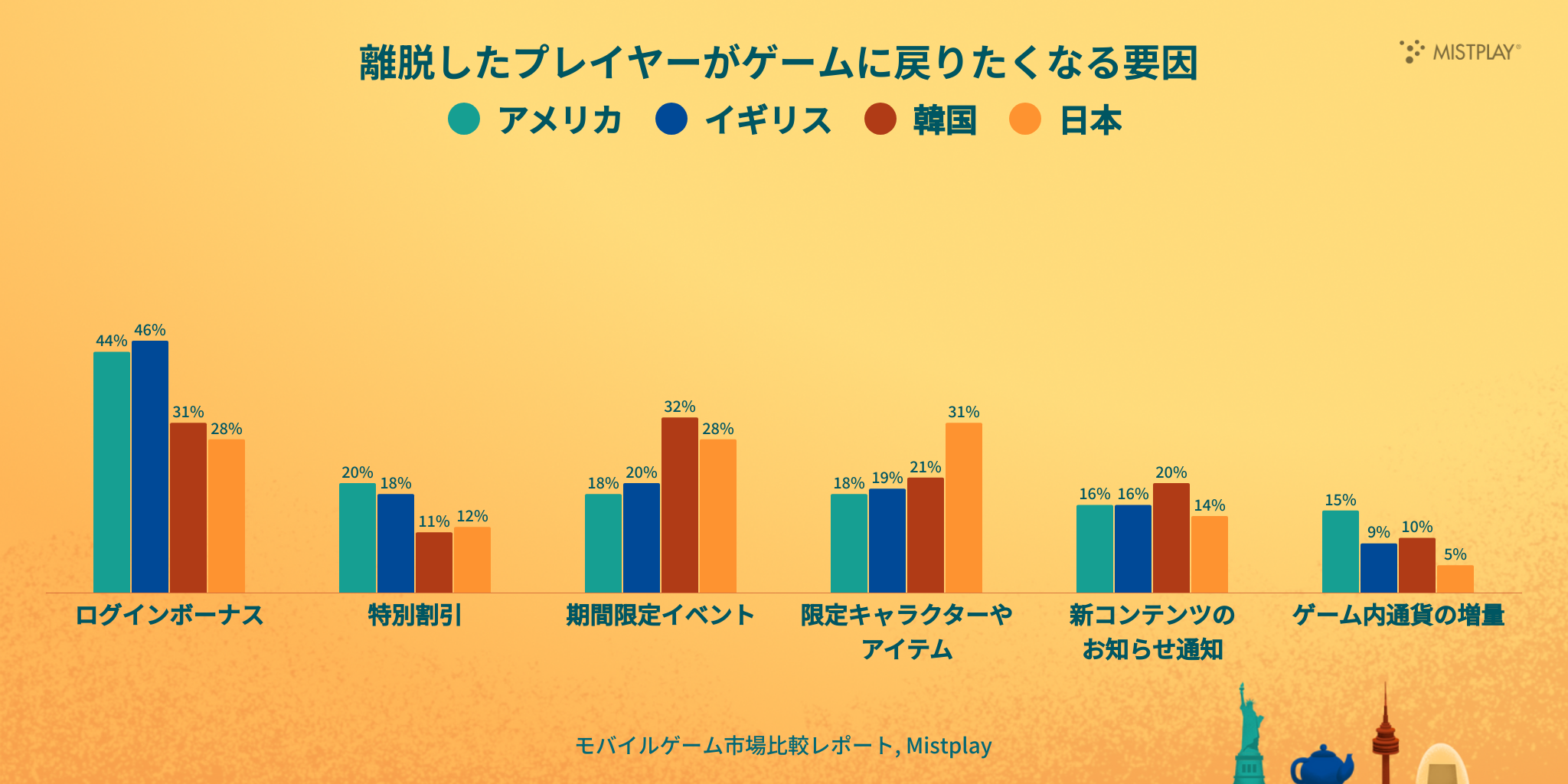 プレイヤーを惹きつけるのは、米英では報酬、日韓ではストーリー性やイベント – 米英では、プレイヤーの60%がゲームに戻る主な理由としてログインボーナスを挙げており、離脱後に戻ってくる理由の多く(45%)も、同様のインセンティブとなっています。一方で日本(47%)と韓国(34%)のプレイヤーは、ストーリー性のある体験や期間限定イベント、限定コンテンツに強く惹かることが判明しました。グローバルで成功するためには、こうした各国ごとの文化的な傾向に合わせたリテンション施策が不可欠です。