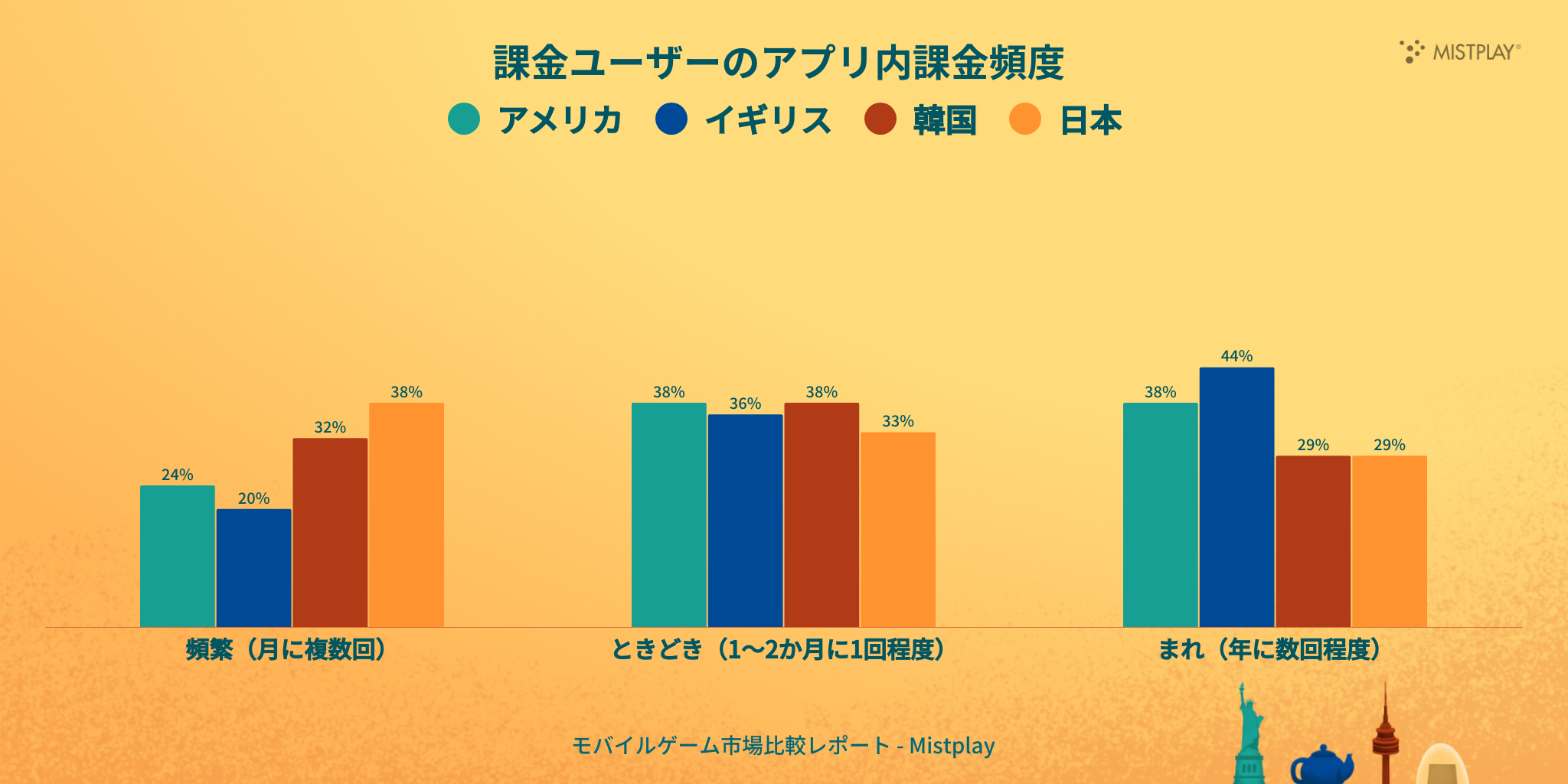 日本の課金傾向は最盛期 – 日本のプレイヤーは、モバイルゲーム市場において極めて質の高いユーザーです。課金して遊ぶプレイヤーの割合、1回あたりの平均課金額ともに日本がトップで、月に複数回課金する人の割合も他国と比較して高く(38%)、日常的に1回のIAP*1あたり10ドル以上を支払う人も3分の1(33%)にのぼります。同レベルの課金額は10人に1人にも満たない米英市場を大きく上回る水準です。