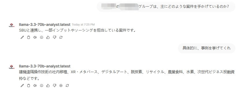 Fine-tuning後のモデルの性能を検証したところ、どの分野の質問に対しても、企業部署・プロジェクトに関して一定水準以上の背景知識や文脈理解を示すことが確認されました(図4)。一方で、より細かな数値や具体的事実の正確な把握、また質問者が期待する回答の精度や粒度の調整など、更なる改善の余地も明らかになりました。