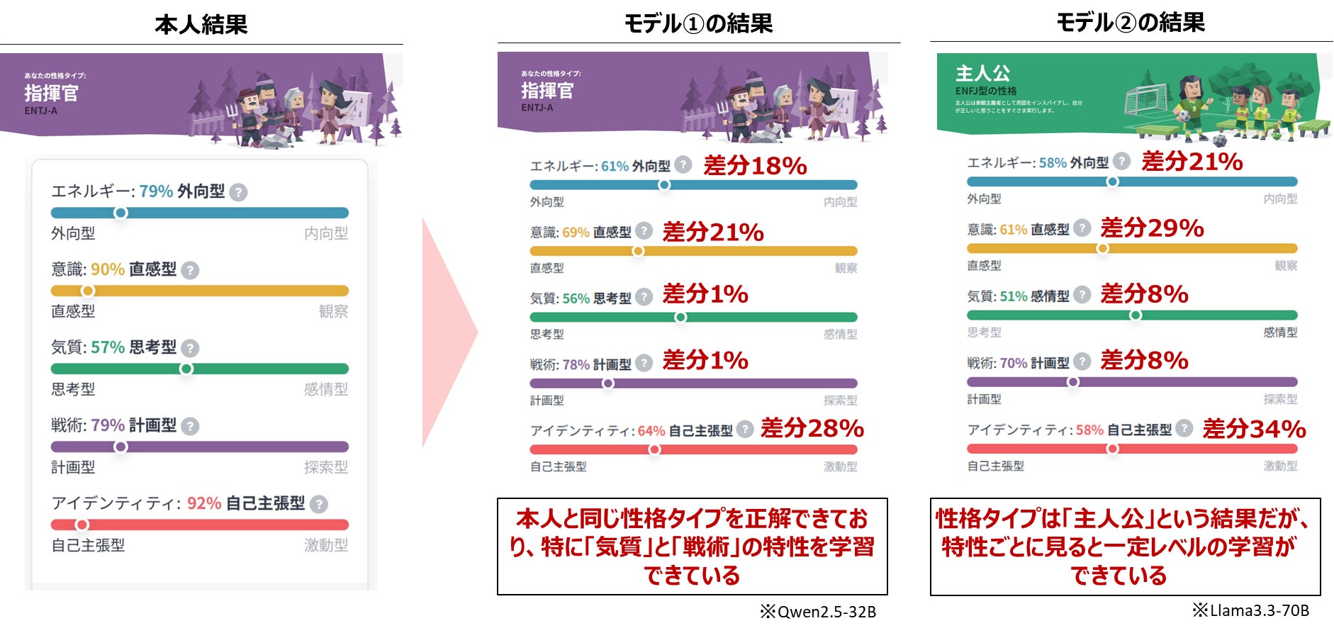 この「AI CEOモデル」の構築に向けて、実際に某大手企業とのPoCでは、ある組織の部門長に対して10時間近いインタビュー音源および、その人物の経営哲学・価値観をまとめたドキュメントをモデルに学習させました。Fine-tuning後、モデルにMBTI(Myers-Briggs type indicator)性格診断を実施させ、本人が実施した結果とどのくらい近い結果が得られるのか検証しました。その結果、本人と同じ性格タイプ(指揮官)を導き出すことに成功しました。(図1)。また、MBTI性格診断以外の質問でも検証を実施した結果、インタビュー・ドキュメント中でしか言及されていないような、本人の根底にある経営哲学・価値観を把握できているケースを確認することができました(図3)。
