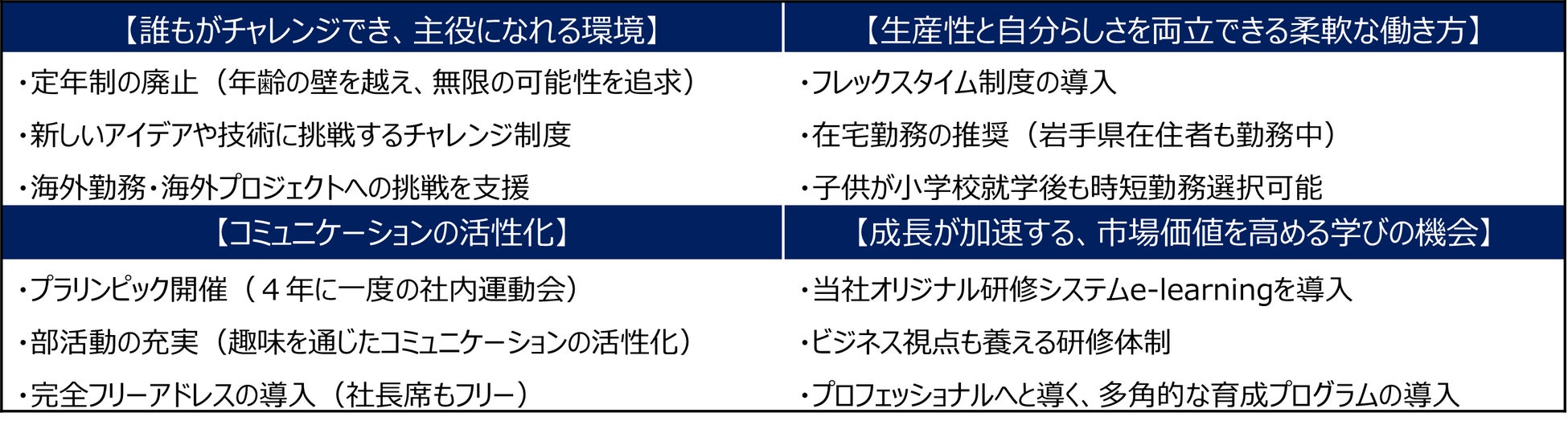 当社は、「社員が最大の経営資源」と考え、行動指針に「Respect Others」「Be Professional」「Grow Together」のコアバリューを掲げ人材育成を重視し、社員全員がともに成長し、社会に貢献できる環境を整えています。併せて働きやすさを重視した様々な取り組みを実施しています。