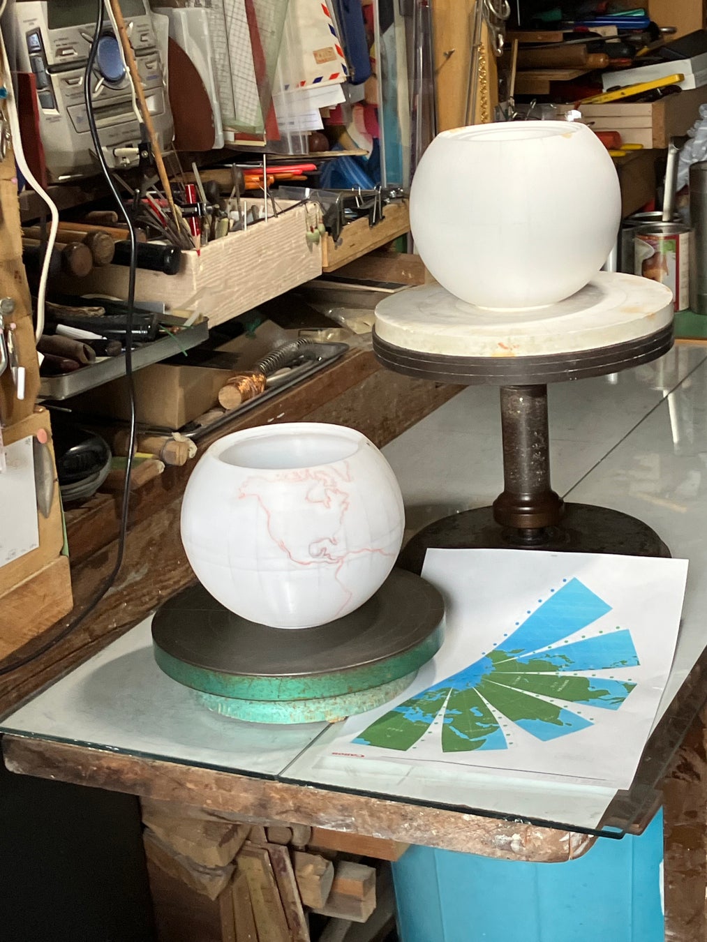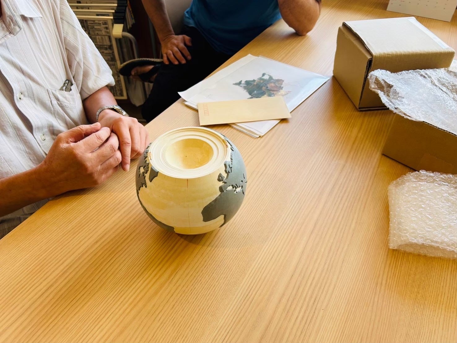 製品を具体的に作り始めて、ぶつかった大きな壁が地球作りでした。天面に大きく空いた穴により、地球をそのまま投影すると主要大陸のひとつであるユーラシア大陸がなくなってしまいます。それでは「育てる世界」の世界観を損なってしまいます。そこで、球体上で大陸ごと下にずらして地図を描きました。すると今度は実際の大陸より陸地の面積が大きくなってしまい、地図が間延びします。その点に注意し、大陸の形と面積に違和感をのない程度の調整をし、地図を配置しました。また、細かすぎる島々は省略するといった細かい調節をしながら3Dプリンターで作ったベースの球体に手描きで世界地図を描き込みました。