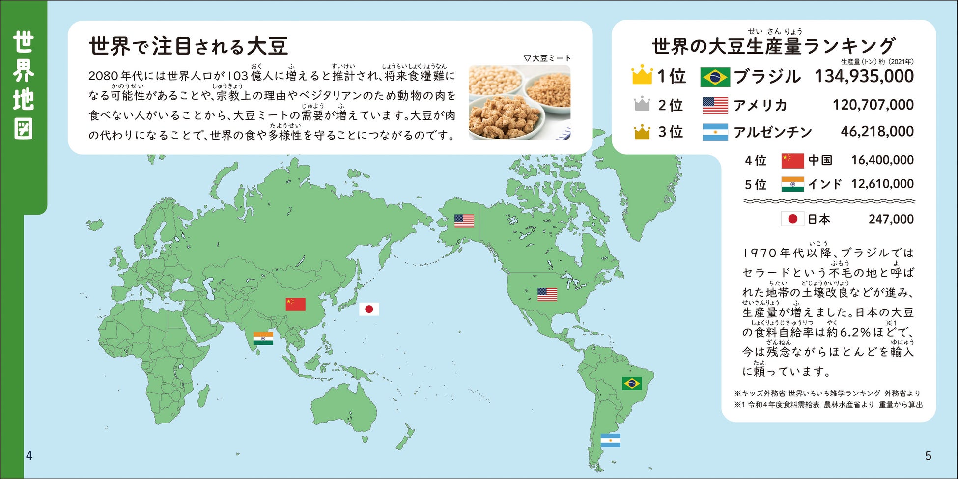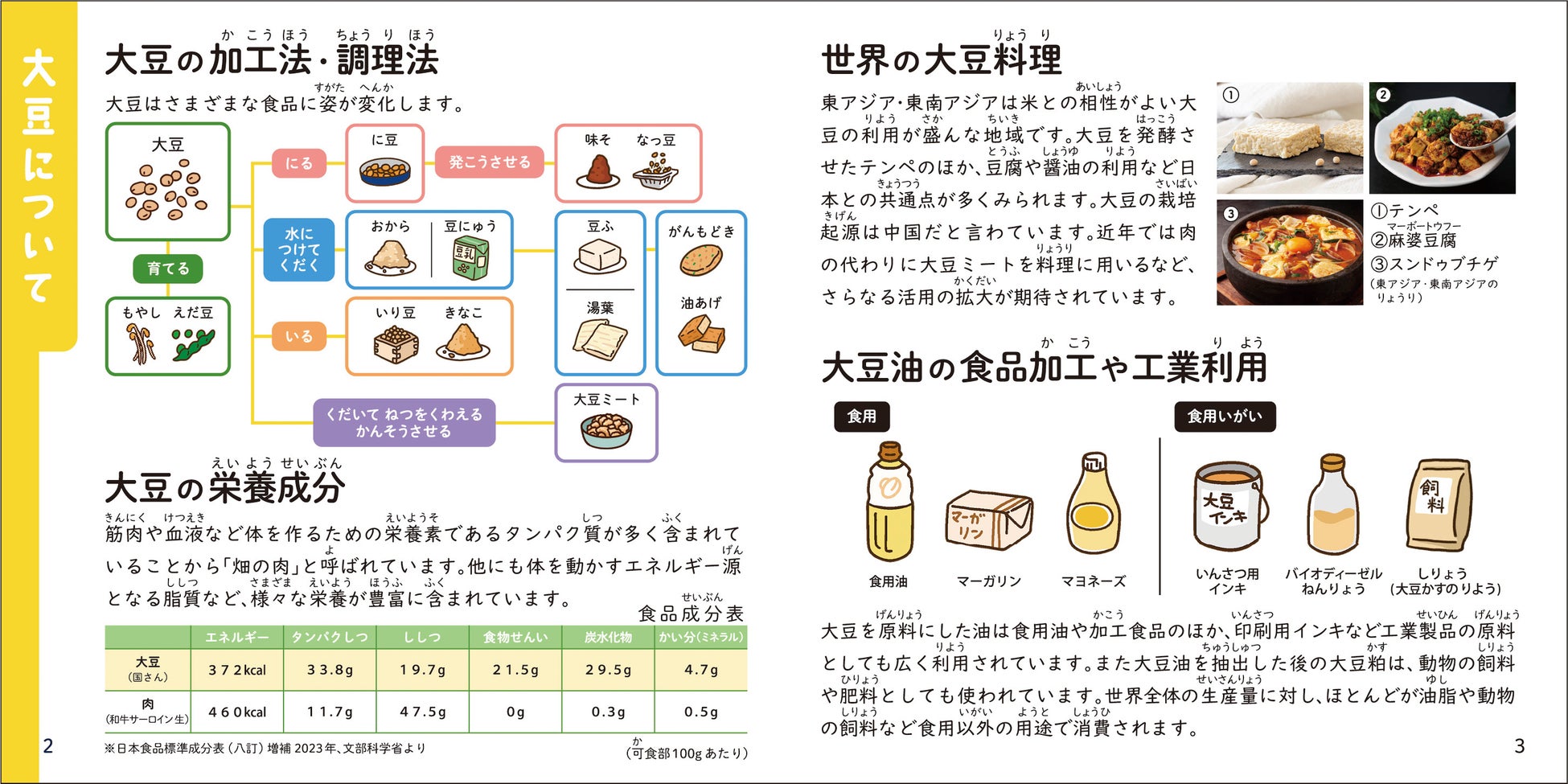 同梱されているハンドブックは、日本人にとって身近な大豆の調理方法などを紹介しながら、食糧危機や飢餓問題を救う鍵となる可能性を秘めた「大豆」の紹介や、世界で見た大豆の有用性についてなど、小学生だけでなく、親子で学べる内容になっています。