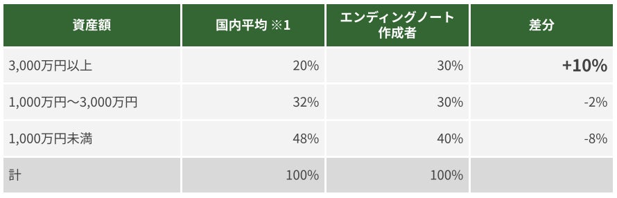 ・エンディングノート作成者は総資産額が国内平均に対して大きい傾向(資産額3,000万円以上の人の割合が国内平均と比較して10%多い)