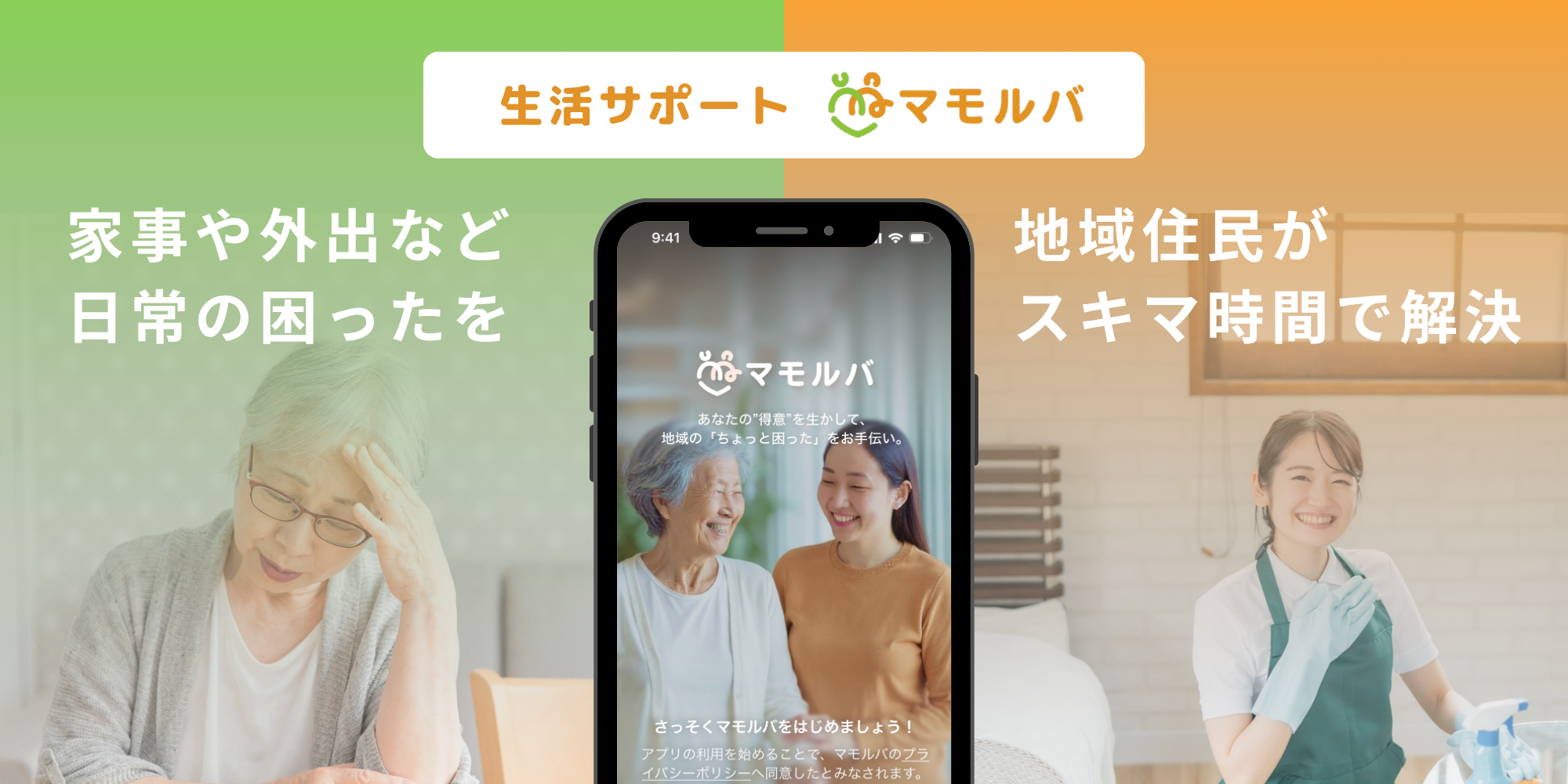 生活サポート「マモルバ」は、地域に住む人の「困った」と「助けたい」をつなぐ仕組みです。高齢者の介護保険外にあたる掃除や買い物代行などの依頼に対して、地域の登録サポーターがすき間時間を活かしてサポートします。