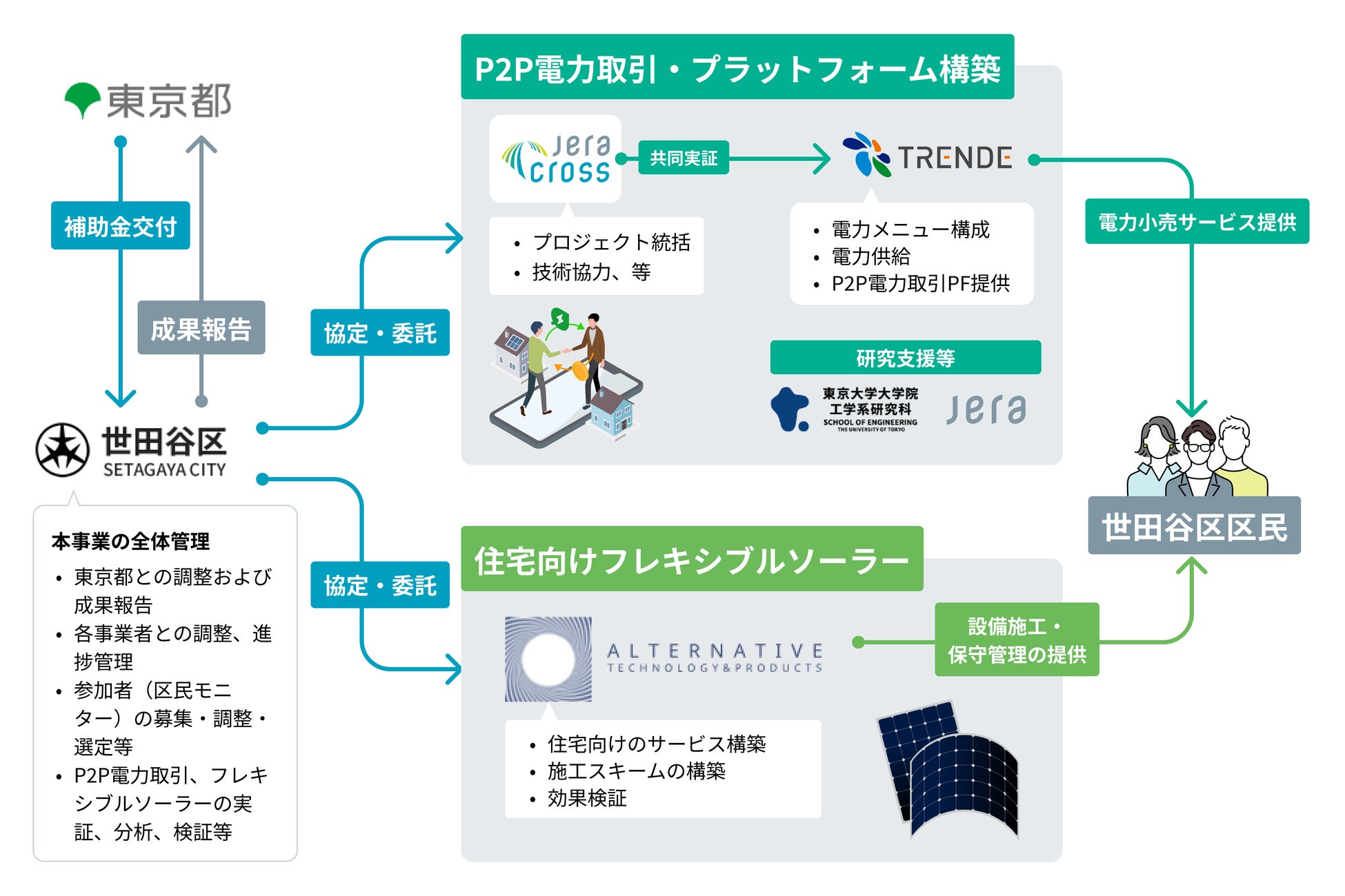 TRENDE株式会社(本社:東京都千代田区、代表取締役:西尾 仁志・妹尾 賢俊、以下「TRENDE」)、世田谷区(区長:保坂 展人)、株式会社JERA(本社:東京都中央区、代表取締役会長 Global CEO:可児 行夫および代表取締役社長 CEO 兼COO:奥田 久栄、以下「JERA」)、株式会社JERA Cross(本社:東京都中央区、代表取締役社長:三木 貴生、以下「JERA Cross」)、株式会社オルタナティブテクノロジー&プロダクツ(本社:東京都港区、代表取締役CEO:坂本 圭介、以下「オルタナティブテクノロジー&プロダクツ」)、国立大学法人東京大学大学院工学系研究科(東京都文京区、研究科長:加藤 泰浩、以下「東京大学」)は、このたび、「住宅地における脱炭素の推進」に向けて、相互に連携・協働していくことに合意しました。