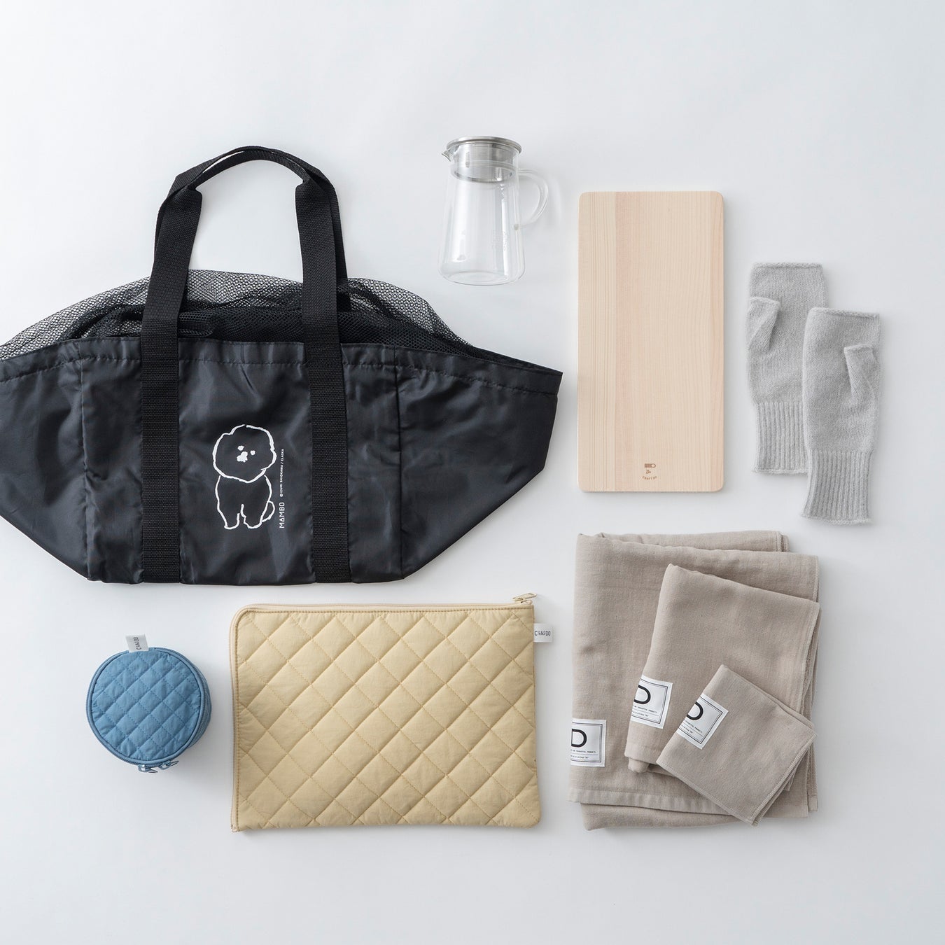 人気のグラスポットやカッティングボード、タオルセット、そして普段のお買い物に便利なMAMBOのレジかごトートなどが入った福袋です。