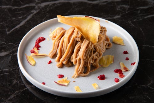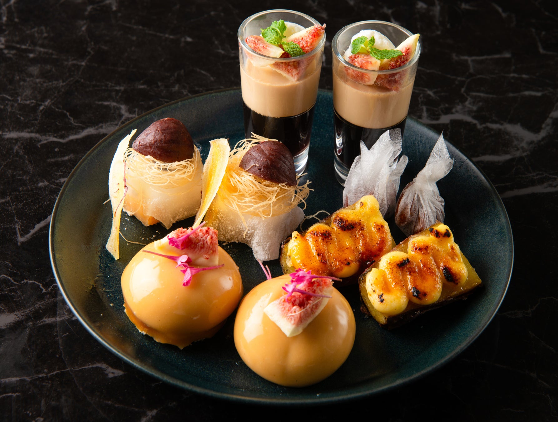 黄金に輝く「ゴールデンアフタヌーンティー」は、贅沢な味覚と優雅さを体験できる特別なひとときをご提供します。上段には、スミスティーメーカーのチャイとロクメイコーヒー/タカムラコーヒー*のブレンドを使用した二層仕立てのジュレ、糖度の高い紅はるかを使用した蜜芋ブリュレ、そしてイチジクとフロマージュブランを繊細にグラサージュしたケーキなど、まさに黄金の輝きにふさわしい豪華なガトー5種が並びます。下段には、栗とシャンピニオンの深い旨味が詰まったキッシュや、旬のイチジクを贅沢に使用した生ハムとモッツァレラのコンビネーションなど、秋の恵みを彩るセイボリーが揃います。ガトーを引き立てる、トリュフマヨで味わうフライドポテトも大人気の一品です。