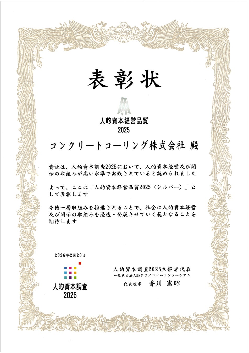 コンクリートコーリング株式会社(西日本)(本社:大阪府大阪市都島区、代表取締役社長:藤尾浩太、以下 当社)は、このたび「人的資本経営品質2025(シルバー)」を受賞いたしました。受賞は2025年2月20日に決定し、このたび表彰状が到着したことを受け、正式に発表いたします。