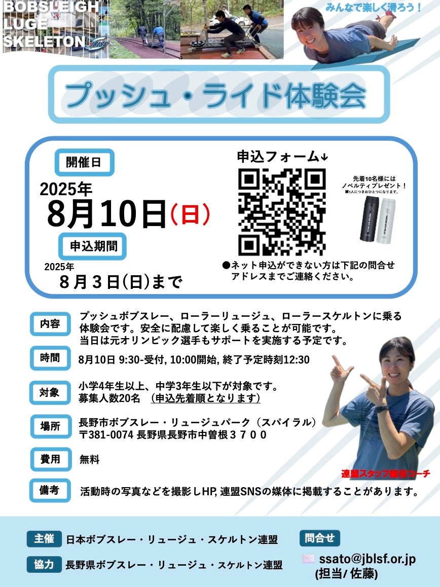 公益社団法人 日本ボブスレー・リュージュ・スケルトン連盟(事務所所在地:東京都新宿区霞ヶ丘町4番2号、代表者:北野 貴裕)は、2025年8月10日(日)に長野市「スパイラル プッシュトレーニング場」にて、「プッシュ・ライド体験会」を開催します。