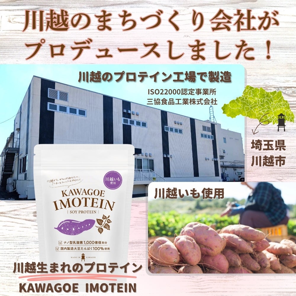 株式会社まちづくり川越(本社:埼玉県川越市新富町1-18-6 本川越戸田ビル403、代表取締役:栗原幹雄)は、地域の名産品「川越いも」を活用したソイプロテイン「KAWAGOE IMOTEIN(カワゴエ イモテイン)」を開発し、2025年9月1日より各ふるさと納税サイトで販売を開始しました。本商品は、川越市内の実績豊富なプロテイン工場に製造を委託し、当社の女性チームが地域の魅力を発信するためにプロデュースした、六次化産業によって生まれたご当地ならではのこだわりのプロテインです。10月以降は、川越市産業観光館「小江戸蔵里」おみやげ処明治蔵にて限定販売を予定しており、美容や健康を意識する仕事や育児に忙しい女性たちを応援します。
