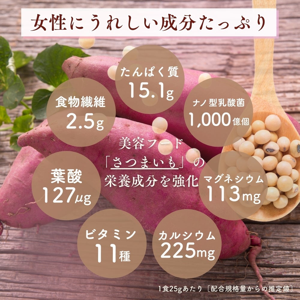 1食(25g)あたり約15.1gのたんぱく質を配合。さらにさつまいも由来の栄養素であるビタミン、カルシウム、食物繊維、葉酸を強化し、植物性乳酸菌を1,000億個配合。美容と健康を両立させた設計です。