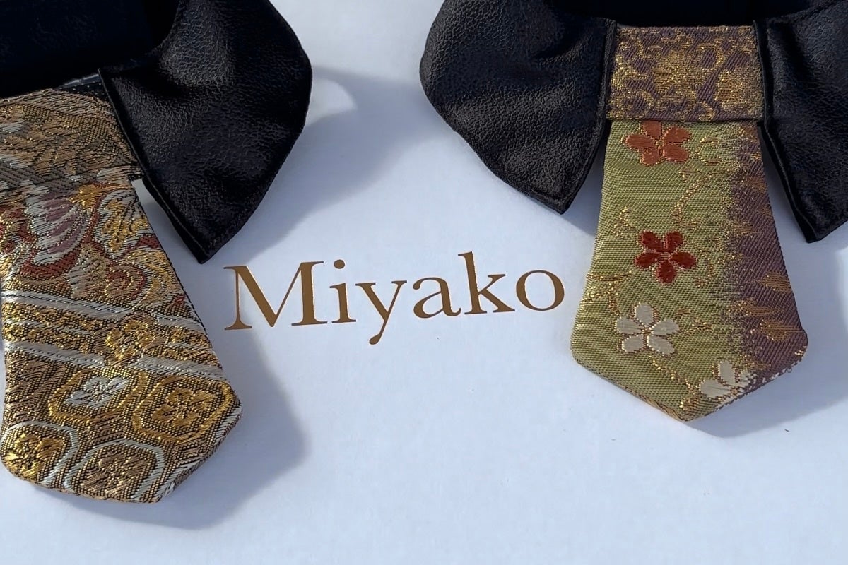 西陣織ドッグウェアブランドMiyakoでは、西陣織や丹後ちりめん、京鹿の子絞りから仕立てるリボン・犬用ネクタイ・犬用スヌードなどを展示、販売いたします。