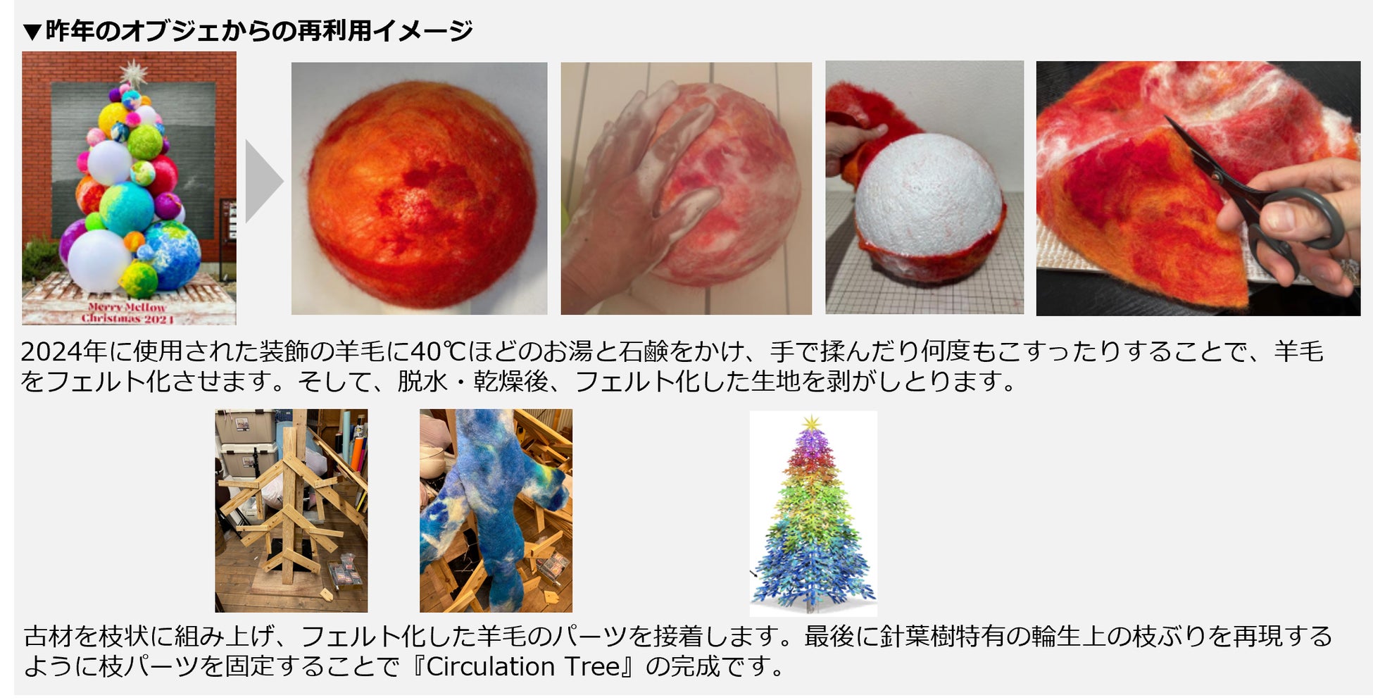今年のテーマ「BORN AGAIN CHRISTMAS」から着想を得て、“~やさしい循環の木~ 何度でも生まれ変わる新たな価値~” をコンセプトに、毛糸から羊毛、そしてフェルトへと姿を変えながら再生を続ける素材に新たな彩を吹き込んだ『Circulation Tree』が登場します。昨年の装飾で使用した羊毛をフェルト化し、ツリー装飾としてアップサイクル。脱水・乾燥・カットなどの工程を経て、これからも再び素材として活かせる“循環のデザイン”を実現しました。