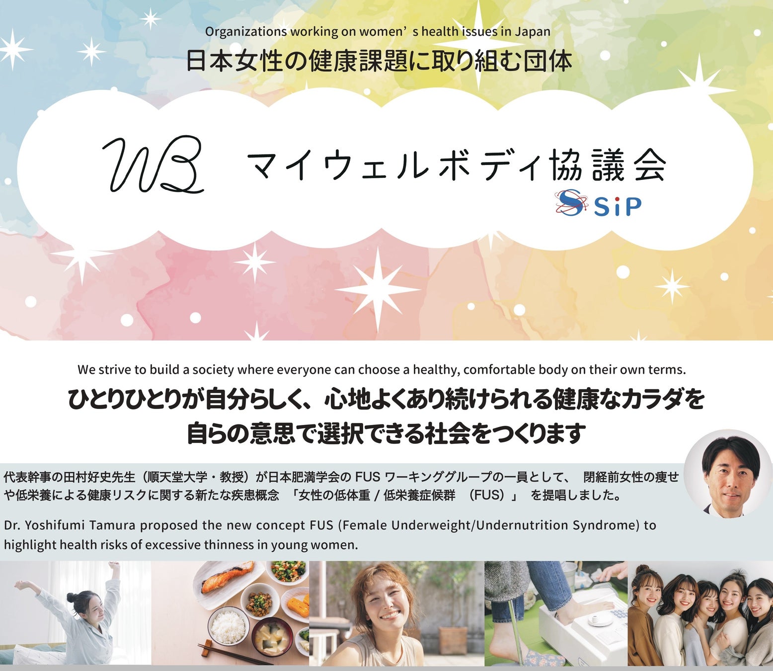 マイウェルボディ協議会は人生100年時代において、誰もが自分らしく健康な身体=“ウェルボディ”を選択できる社会の実現を目指す産官学の協議会です。2023年に設立され、内閣府戦略的イノベーション創造プログラム(SIP)「包摂的コミュニティープラットフォームの構築」の一環として、「女性のボディイメージと健康改善のための研究開発」を背景に活動を開始しました。誰もが健康な心と身体について学び、自分に合ったウェルボディを選び、それが尊重される社会を目指して取り組んでいます。