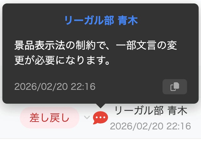 承認されたページには、承認者の名前と日時が記録されます。また、差し戻し時には、その理由をコメントとして残すことができます。