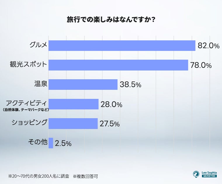 また旅行での楽しみを調査したところ、グルメや観光スポットと答えた方が大半という結果になりました。