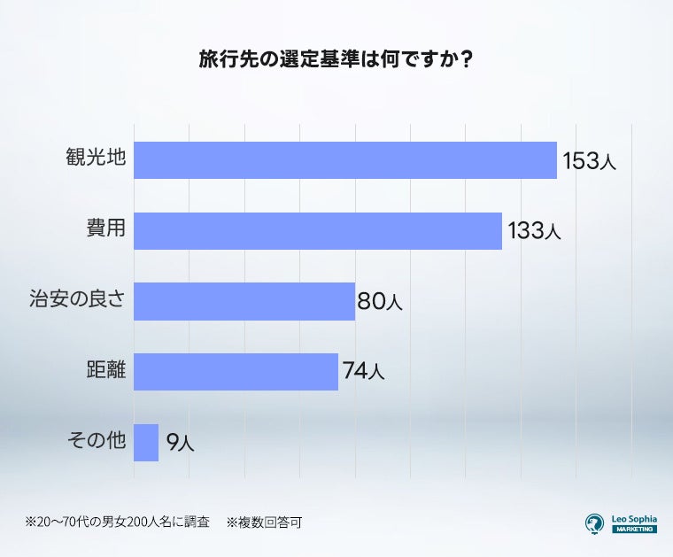 旅行先を選ぶときは200名中153名の方が観光地、133名の方が費用に注目しています。(複数回答可)
