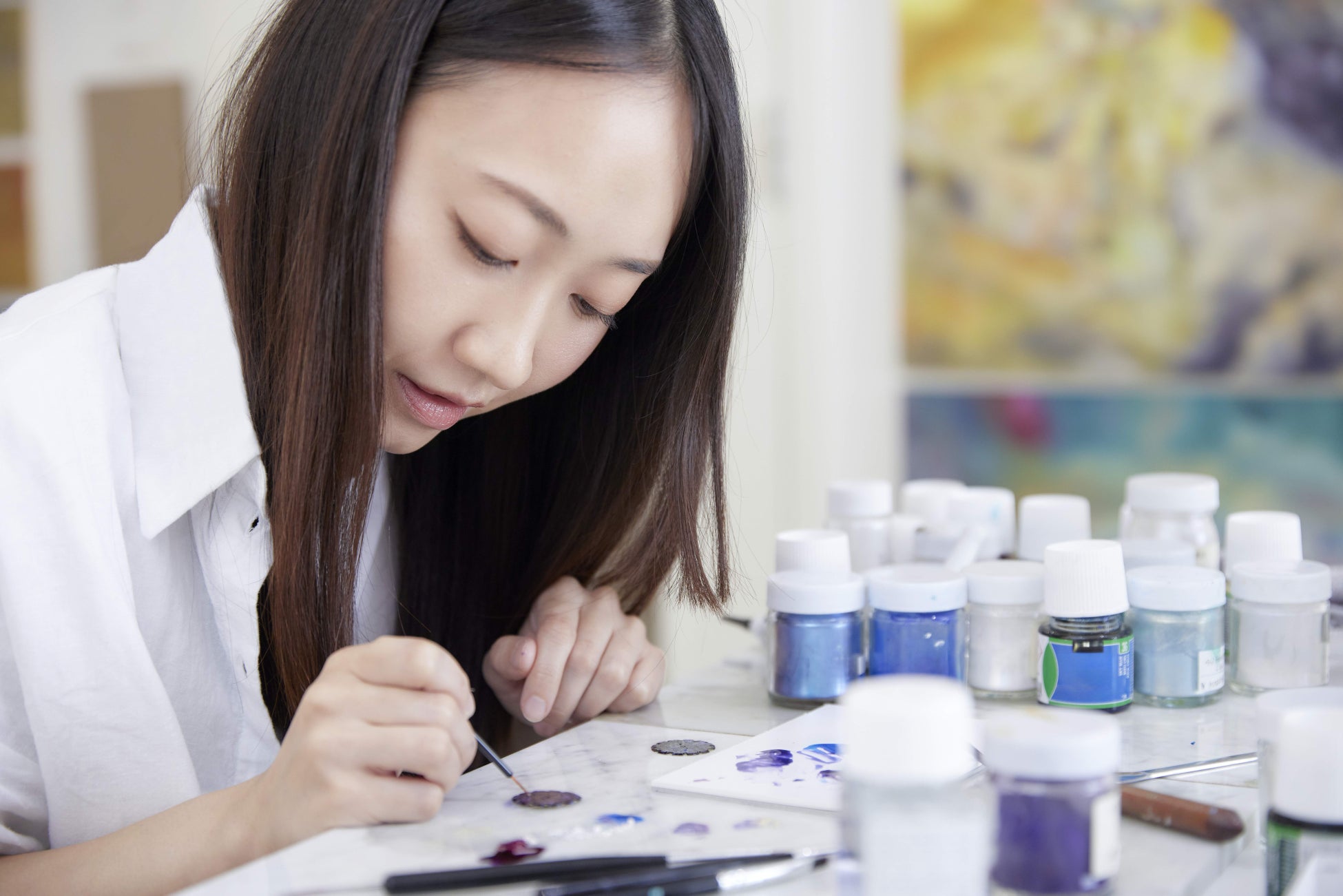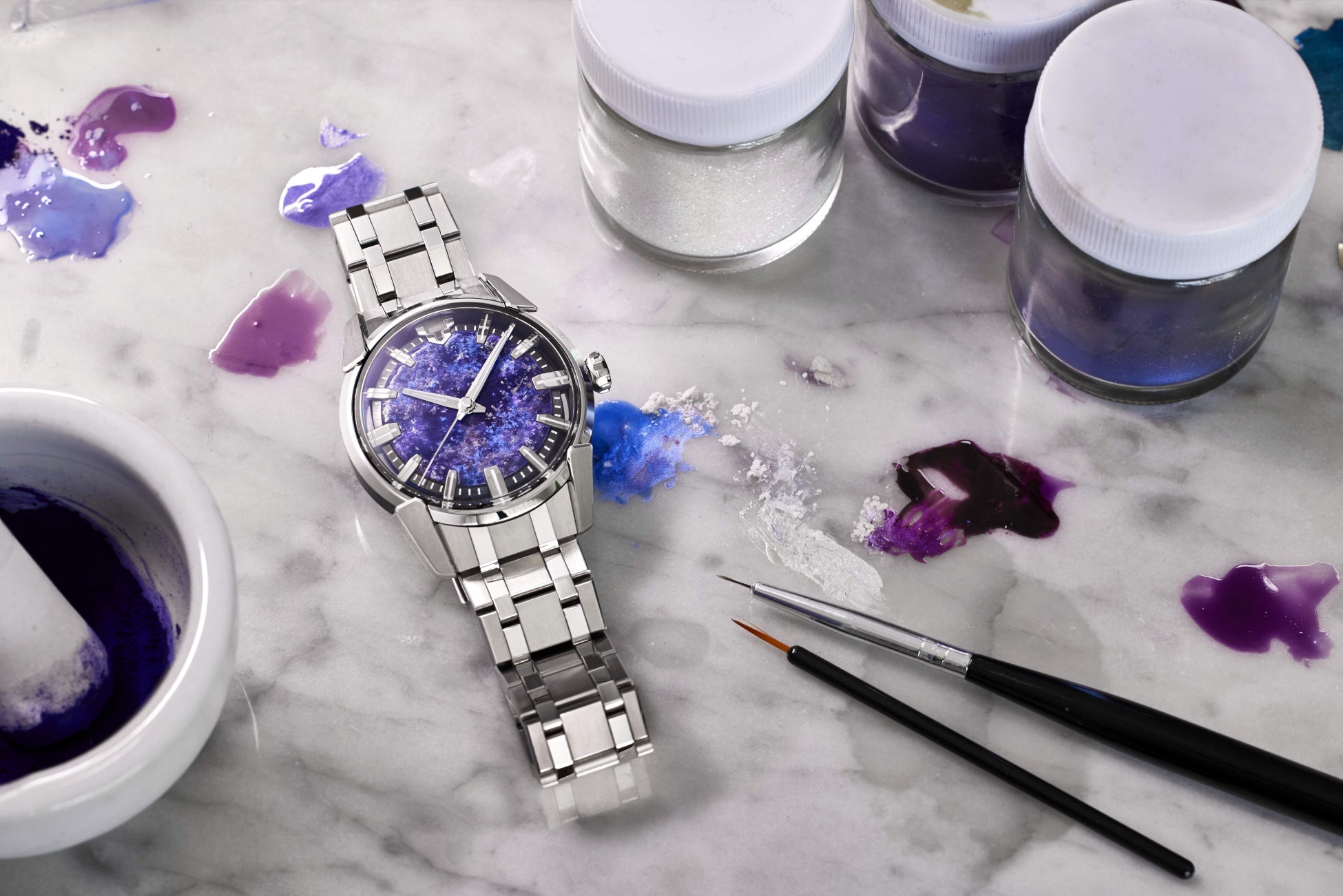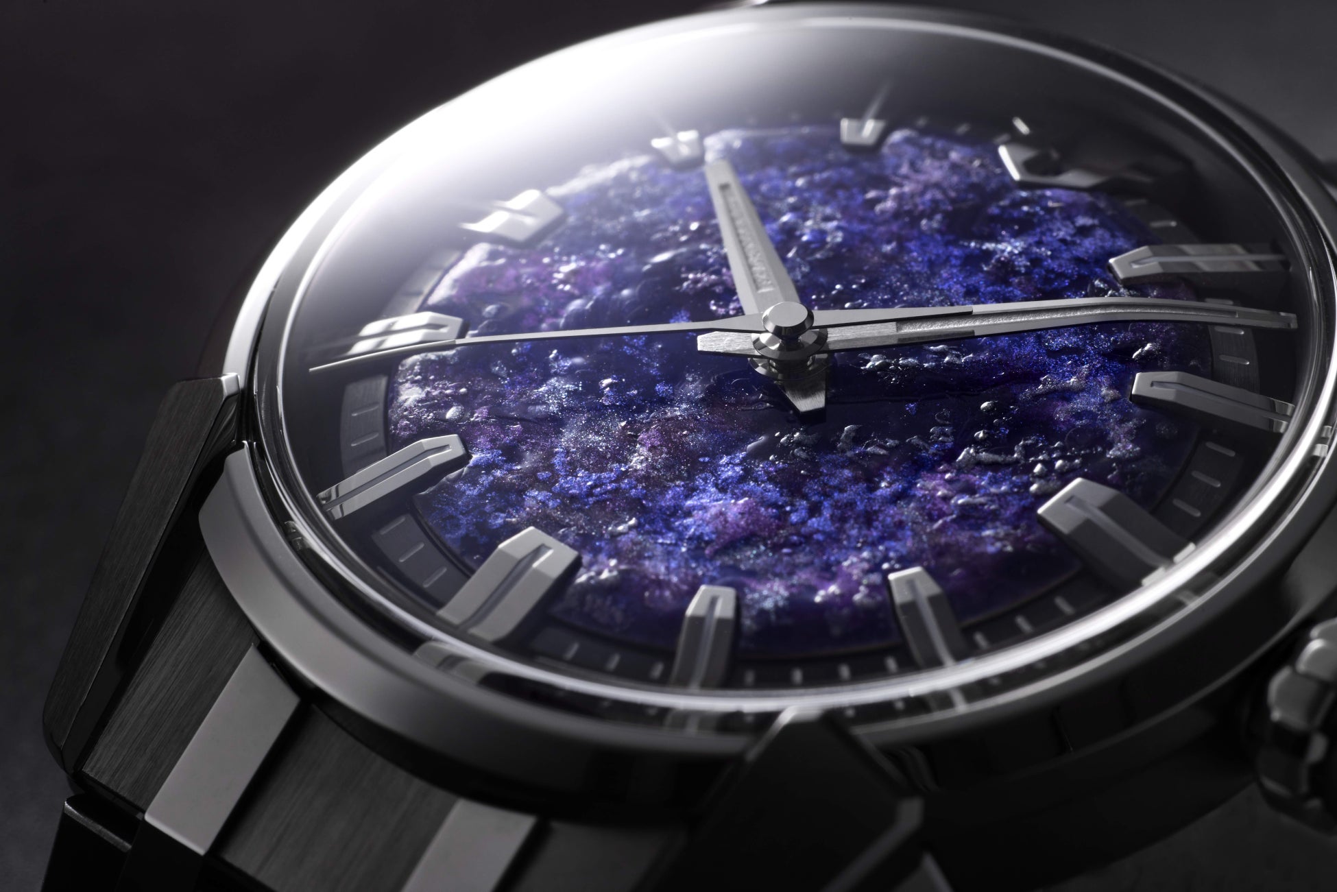 DIVIDOの見る角度によって表情を変える造形、積み重なる多面体による複雑な輝きに呼応するよう、文字盤を見る角度によって異なる色彩が現れるように描き、作品を制作しました。パール材による繊細な輝きと絵の具のグラデーションによって、文字盤の向こうには星雲のようにも、あるいは雪景色のように感じられるような、多層的な絵画空間が現れます。神秘的で高貴な色彩が、このコレクションをお持ちになる方にとって世界があることの神秘そのものに思いを馳せられるような特別な経験を与えてくれることを願っています。
