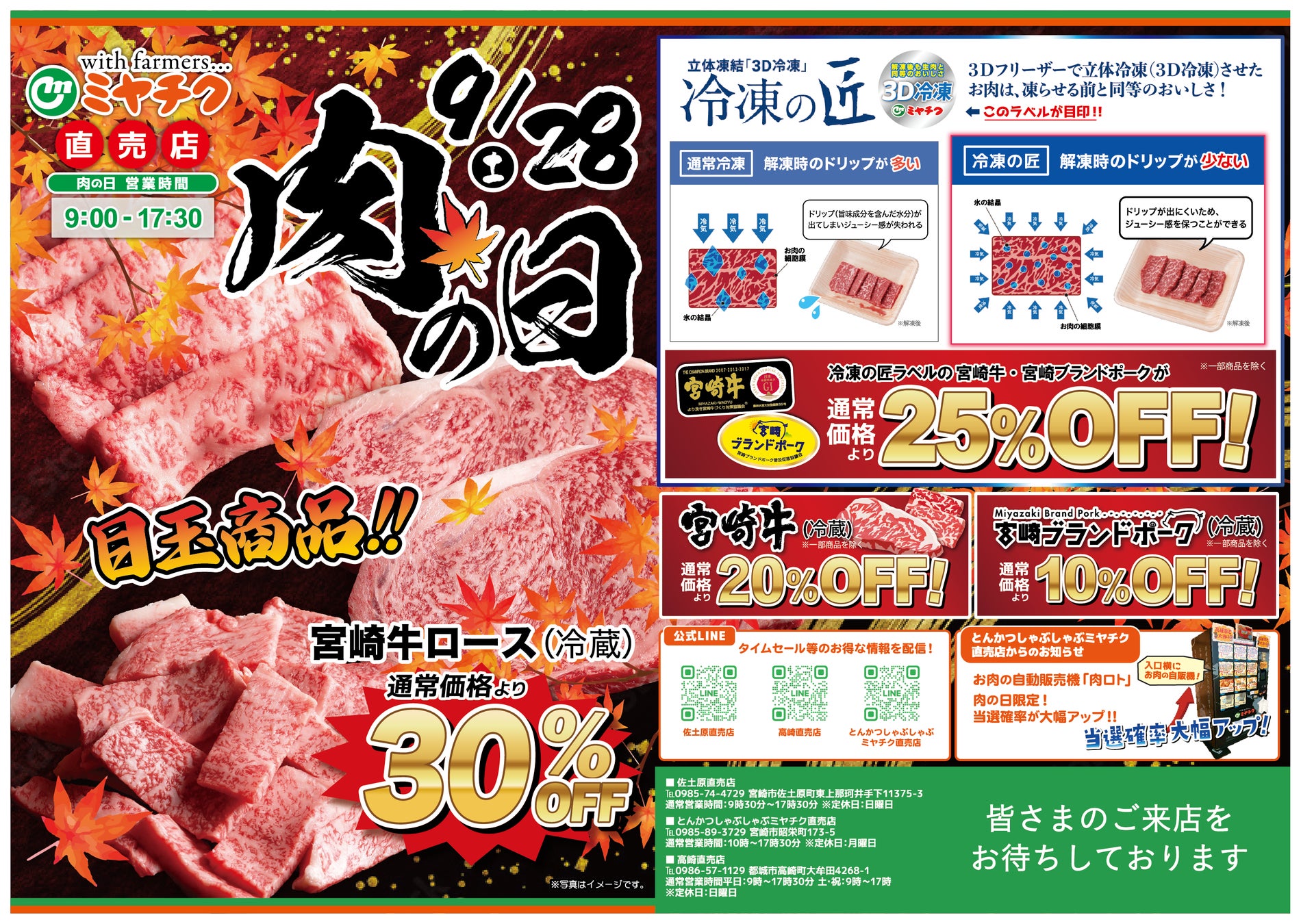 株式会社ミヤチク(本社:宮崎県都城市/代表取締役社長:船ヶ山 祐二)が運営する「宮崎牛」「宮崎ブランドポーク」「ハム・ソーセージ」を取り扱う直売店(宮崎県内3店舗)にて、9/28(土)にお肉が割引価格でお買い求めいただける「肉の日」を開催します。