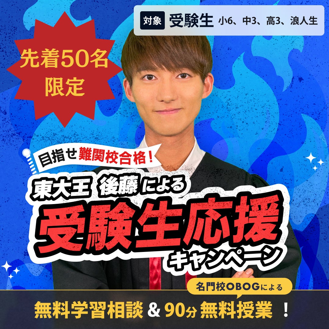 受験のプロフェッショナルである代表・後藤が、受験直前の不安やお悩みにお答えします。さらに、名門校出身の教師の90分授業を無料でご体験いただけます。