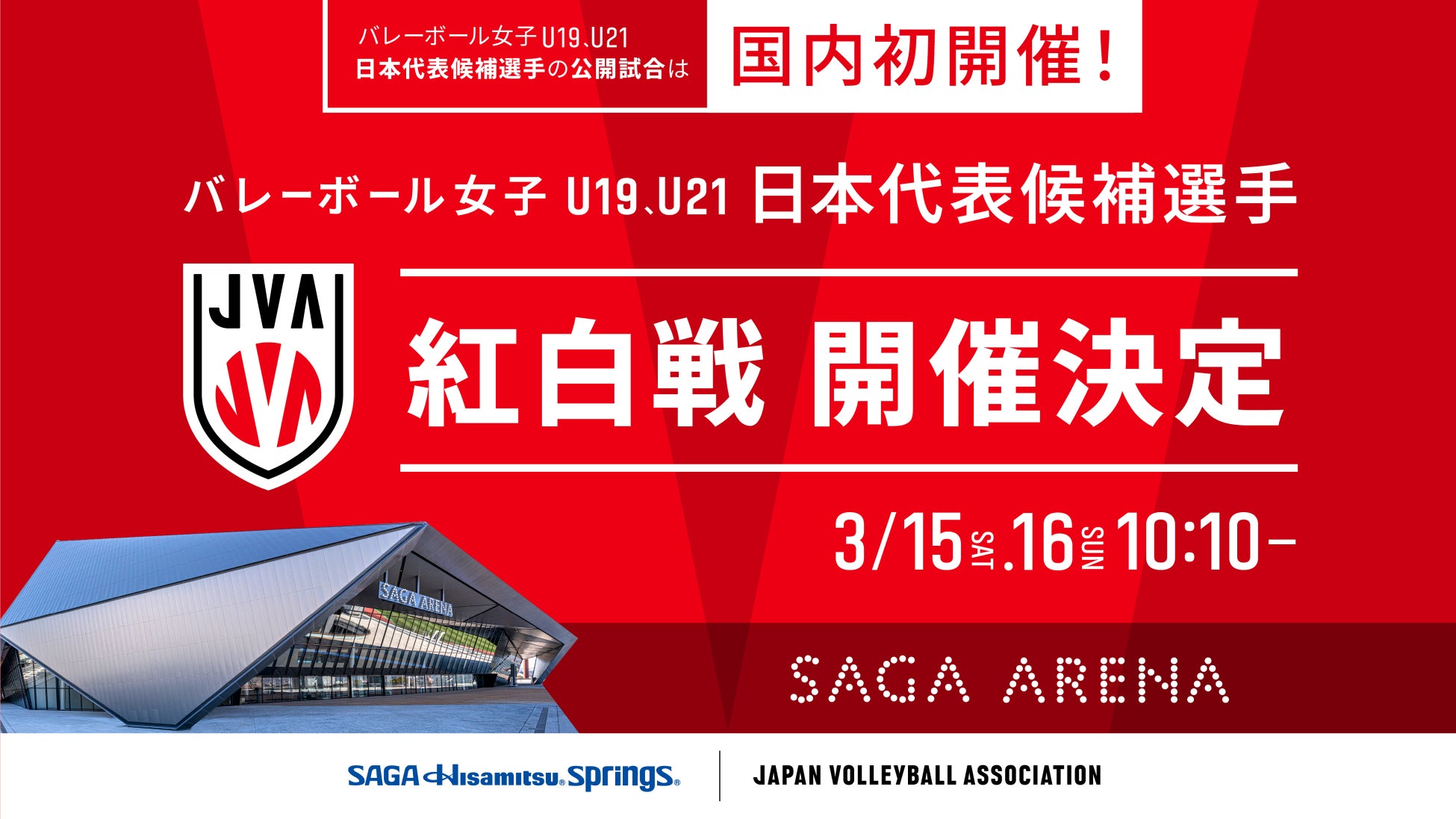 大同生命SV.LEAGUE第19節3月15日(土)、16日(日)の両日SAGAアリーナで、バレーボール女子U19、U21日本代表候補選手の紅白戦の実施が決定しました。バレーボール女子U19、U21日本代表候補選手の公開試合は国内初開催となりますので、是非次世代の日本代表としての活躍が期待される選手へ応援をよろしくお願いいたします。
