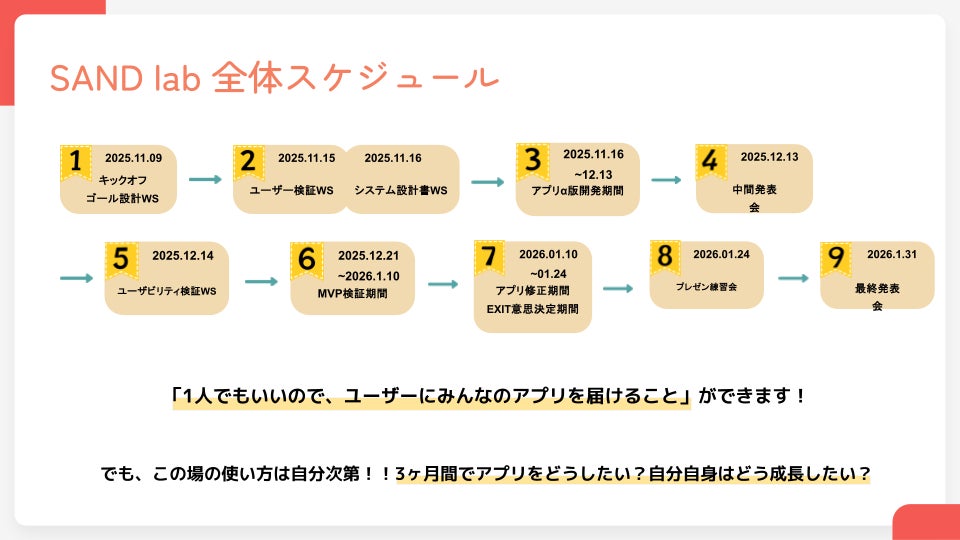 第一弾として、2025年11月より3ヶ月間の「SAND lab 2025」プログラムを開催することを決定しました。中高生が「未来の起業家」として社会課題の解決に挑みます。