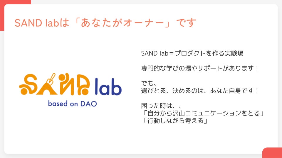 SAND labは、この理念に基づいた新しい起業家教育の形です。大人子どもの垣根を超えた共創の場として、砂場のように挑戦と創造が溢れる実験拠点を目指していきたいと思っています。