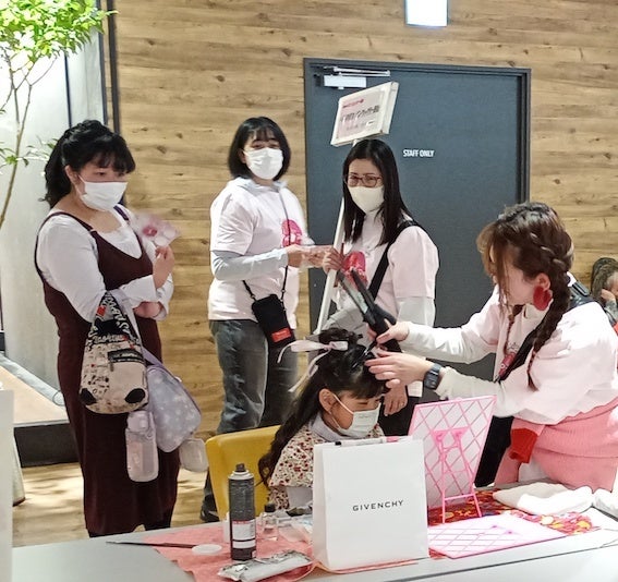 津口さんは「MUSASHI×えんむすび×横須賀市」でコラボ作品を制作して万博の『世界のMUSASHI個展』で展示することを提案し、MUSASHIを紹介するという数珠つなぎから、この企画が実現したのだ。コラボの内容としては、えんむすびでピンクシャツデー運動を含めた全国の子どもたちの撮影会を実施し、その写真でMUSASHIがモザイクアートを完成させるというもの。この日のイベントでもヘアセットコーナーを設け、えんむすび一般社団法人理事の曽田葵さん(福祉美容師・ヘアメイクアップアーティスト)が子どもたちのヘアセットを担当し、撮影がされた。