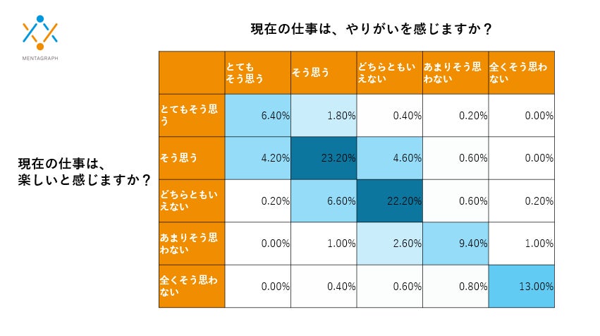 上記の結果より、仕事を楽しんでいる人ほど、仕事へのやりがいを感じ、仕事へのモチベーションにつながっていることが推察され、心理的な充実感がモチベーションに直結していることが分かります。