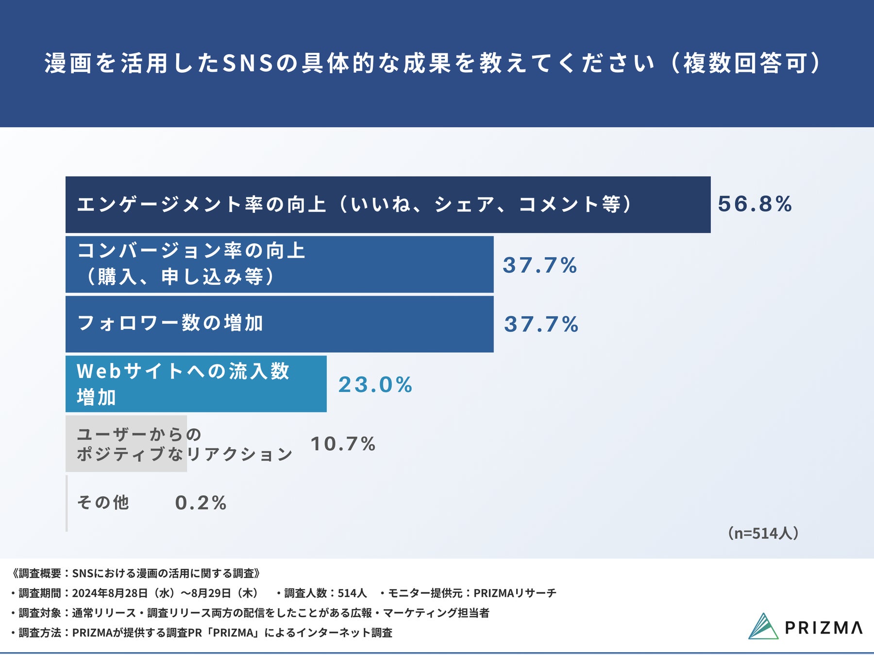 「Q6:漫画を活用したSNSの具体的な成果を教えてください(複数回答可)」と質問したところ、『エンゲージメント率の向上(いいね、シェア、コメント等)(56.8%)』と回答した方が最も多く、次いで『コンバージョン率の向上(購入、申し込み等)(37.7%)』『フォロワー数の増加(37.7%)』『Webサイトへの流入数増加(23.0%)』と続きました。