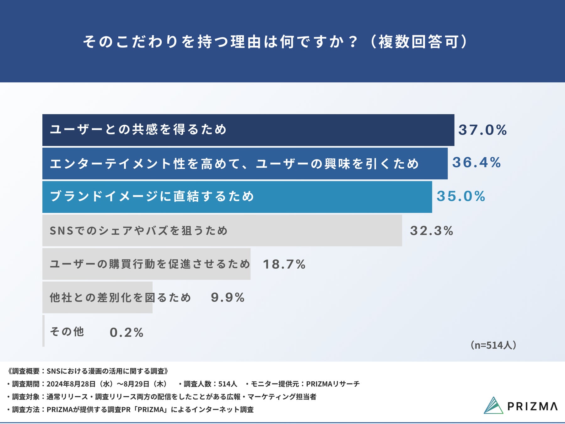 「Q4:そのこだわりを持つ理由は何ですか?(複数回答可)」と質問したところ、『ユーザーとの共感を得るため(37.0%)』と回答した方が最も多く、次いで『エンターテイメント性を高めて、ユーザーの興味を引くため(36.4%)』『ブランドイメージに直結するため(35.0%)』と続きました。