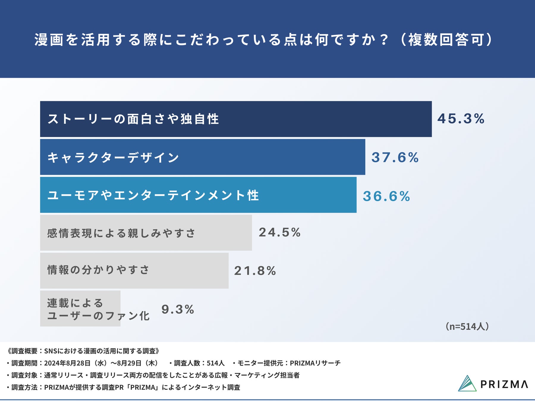 「Q3:漫画を活用する際にこだわっている点は何ですか?(複数回答可)」と質問したところ、『ストーリーの面白さや独自性(45.3%)』と回答した方が最も多く、次いで『キャラクターデザイン(37.6%)』『ユーモアやエンターテインメント性(36.6%)』と続きました。