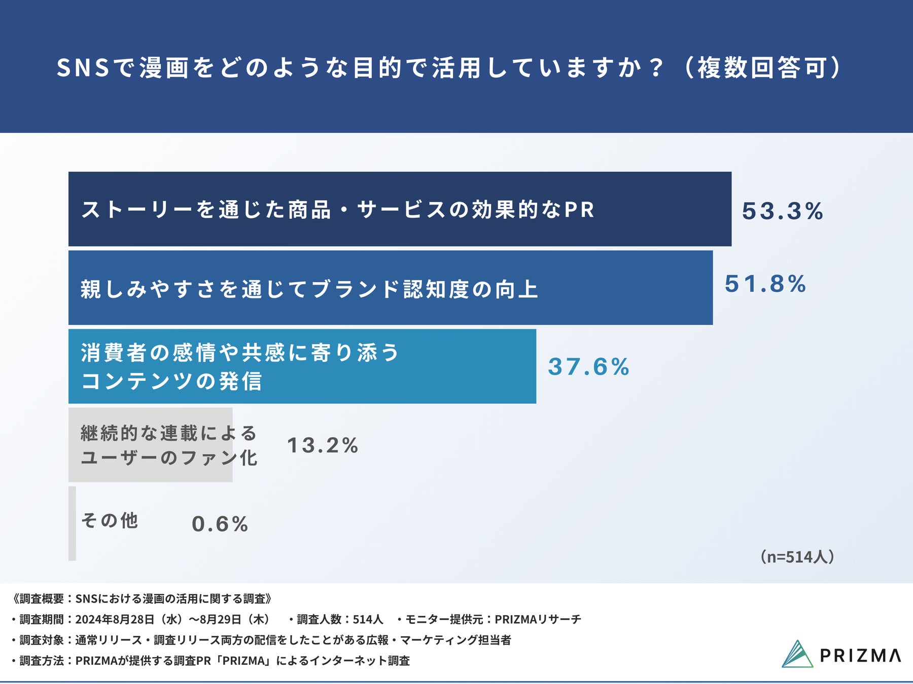 そこで今回、株式会社PRIZMA(https://www.prizma-link.com/manga)は、SNSで漫画を活用したPR施策を実施したことがあるマーケティング担当者514名を対象に、「SNSにおける漫画の活用に関する調査」を行いました。