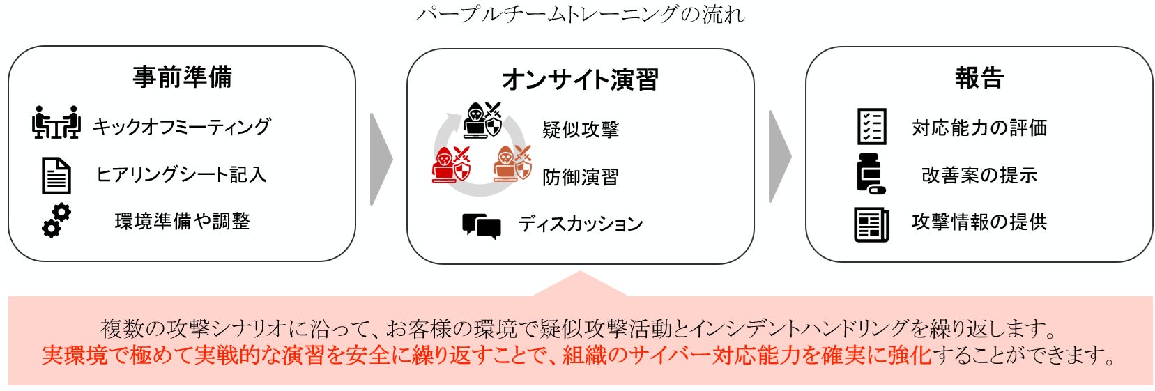 お客様が選択可能な複数のシナリオに沿って数日間のトレーニングを実施する中で、CSIRT/SOCメンバーは実際の"守るべき環境"での本番さながらのインシデントハンドリングを安全にシミュレーションすることができます。