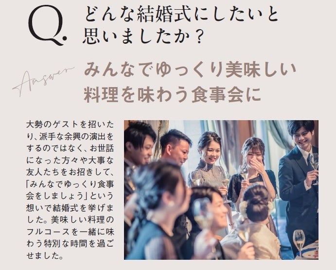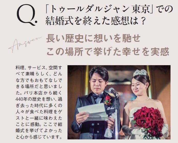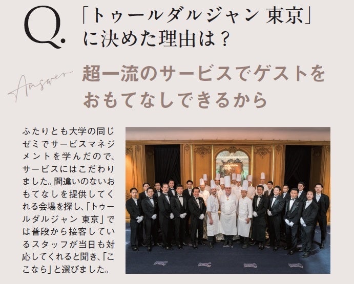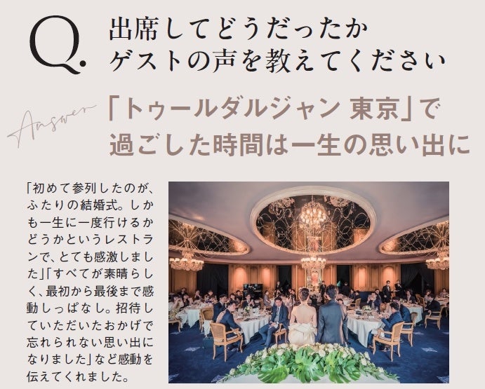 編集部が行った「トゥールダルジャン 東京」でのウエディングを選んだカップルたちへのアンケート調査では、「超一流のサービススタッフによるおもてなし」「歴史的なシグネチャー料理」「パリの雰囲気を感じさせる寛ぎの美空間」という声があがったほか、1万坪もの庭園を持つ日本を代表する名門ホテルとして60年の歴史を刻む「ホテルニューオータニ」の贅沢な景観や、ホテルスタッフのホスピタリティ、さらに昨今の花嫁たちがホテル婚を選ぶキーワードとなっている「2泊3日のステイ&ウエディング」「フォトジェニックウエディング」「記念日に訪れられる場所」というニーズもすべて最上級のクオリティで贅沢に叶えられることが決め手となっていることが分かりました。