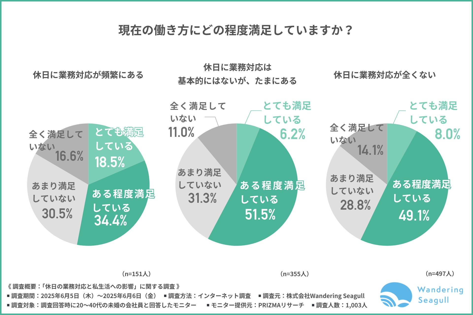 一方で、働き方そのものへの満足度は、休日対応の有無だけで決まるものではなく、業務内容や職場環境など多様な要素が関わっていることもわかりました。