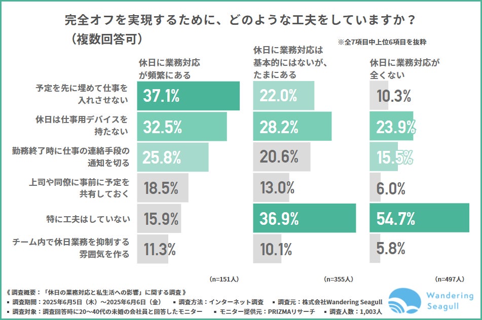 「完全オフを実現するための工夫」について、休日対応の頻度別に尋ねたところ、上位3つは以下のような結果になりました。