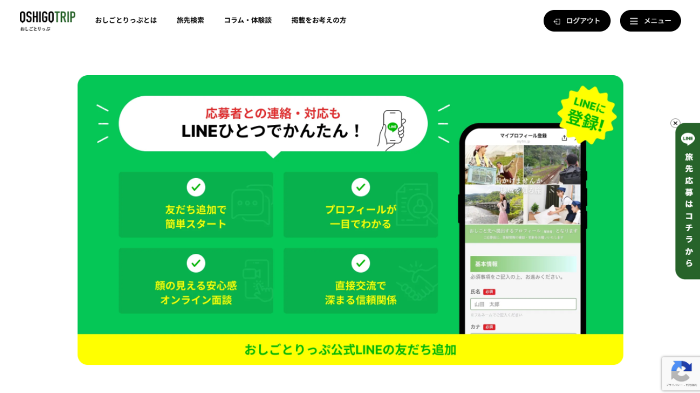 同サービスは大阪府主催のビジネスプランコンテストで優秀賞を受賞しており、地域の魅力と働く体験を通じて新しい旅のカタチを、より分かりやすく魅力的なサービス紹介ができるよう、表現方法を見直し、コンテンツの大幅な充実を図りました。