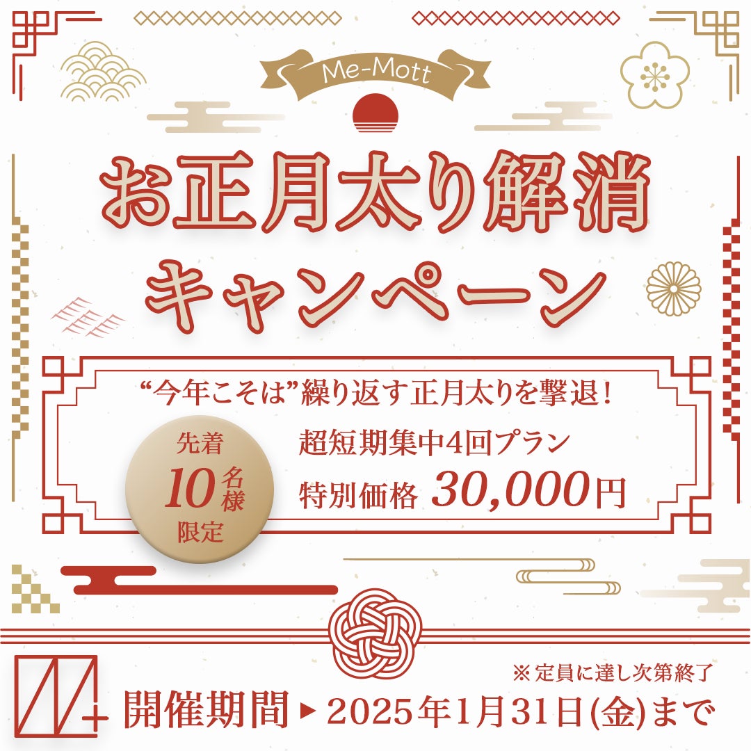 株式会社ISSHIN(本社:東京都中野区、代表取締役CEO:陳紀洋)が運営するMe-Mottパーソナルジム中野店は、2025年1月4日(土)より「お正月太り解消キャンペーン」を開催いたします。本キャンペーンでは、通常より10%以上お得な「超短期集中4回プラン」(30,000円)を先着10名様限定でご提供いたします。