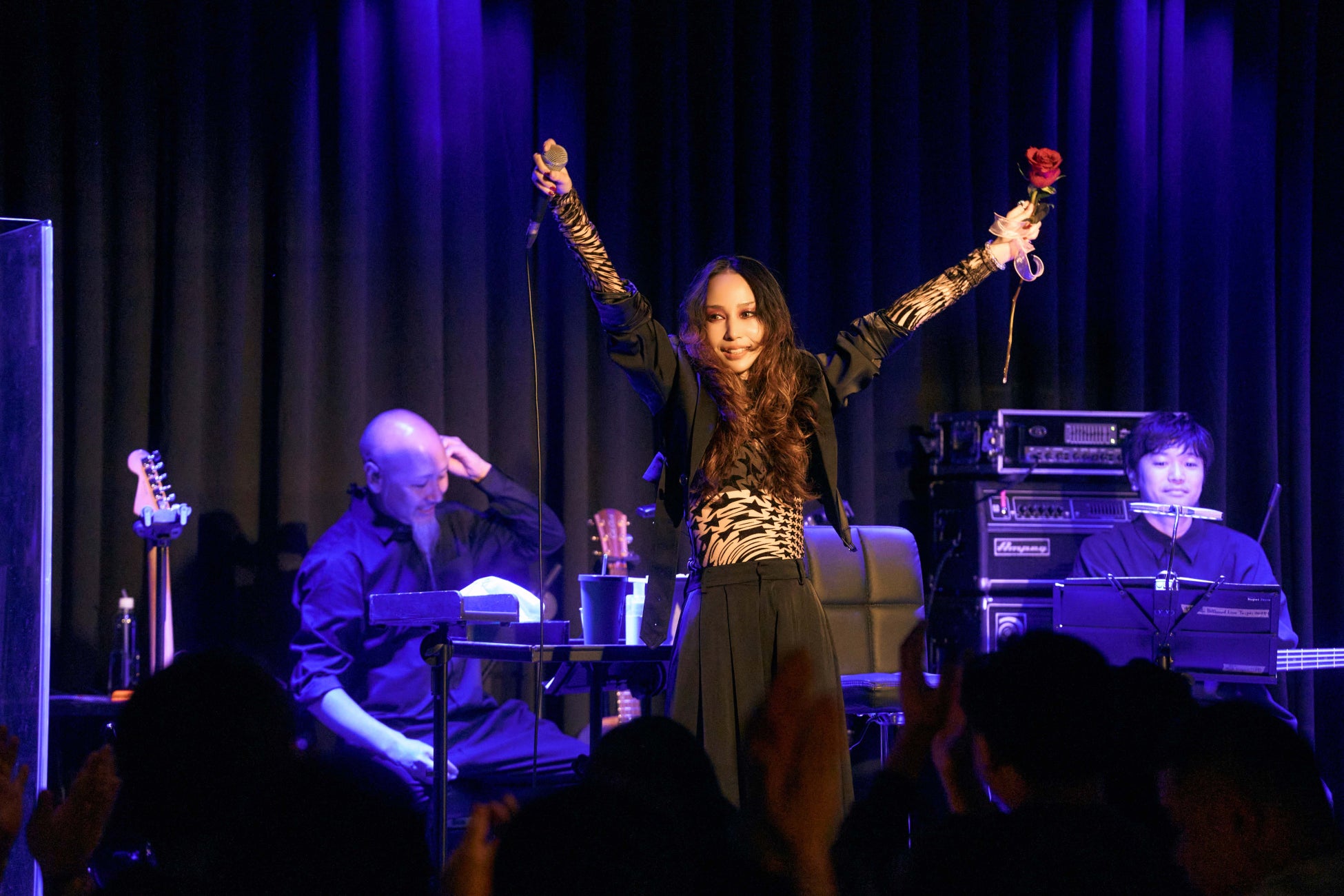 代表曲「花束」でしっとりと始まり、「桜色舞うころ」「Glamorous Sky」「Love is Ecstasy」など名曲の数々を披露。曲の合間、テーブルに並んだ料理に言及するほか、前方のお客様と会話、そして次々にハイタッチするなど、ステージと客席が近い「Billboard Live TAIPEI」ならではの空間を楽しんだ様子でした。