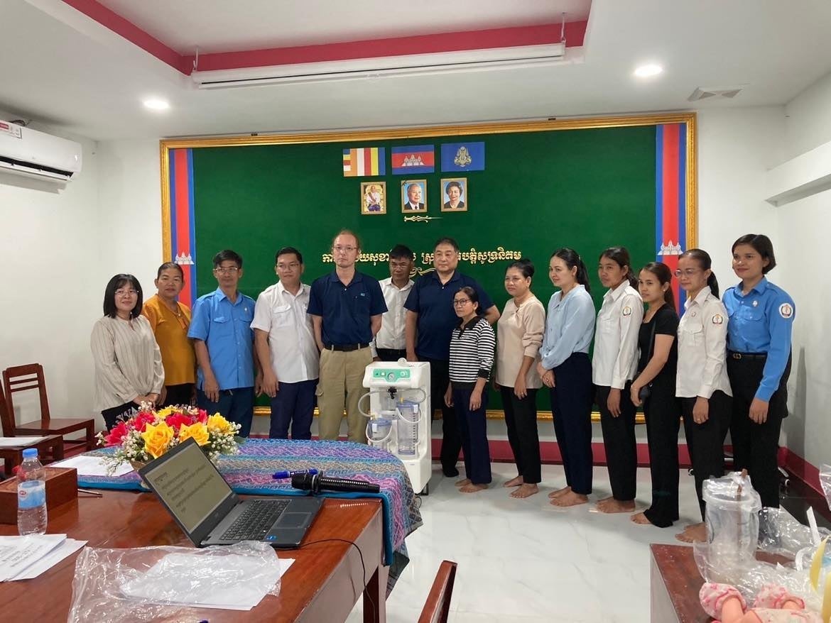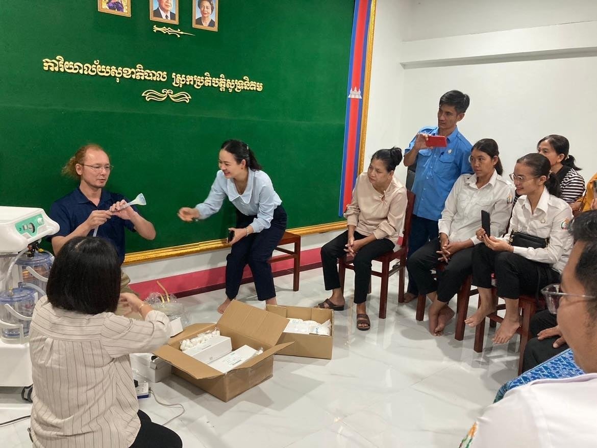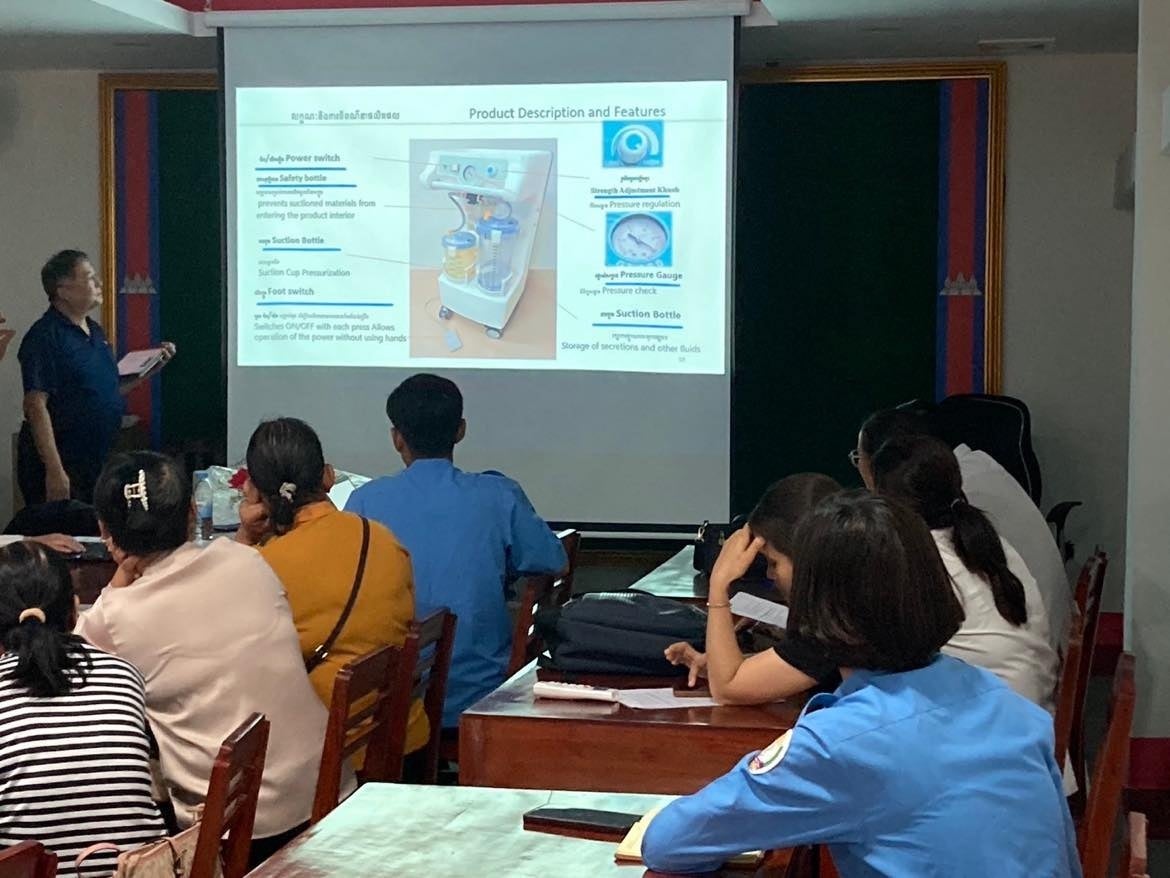 会場となったのは、シェムリアップ州のソトニクム保健行政区。寄贈先の病院と保健センターの医師や助産師を対象に、吸引分娩器の構造や使用方法について説明しました。