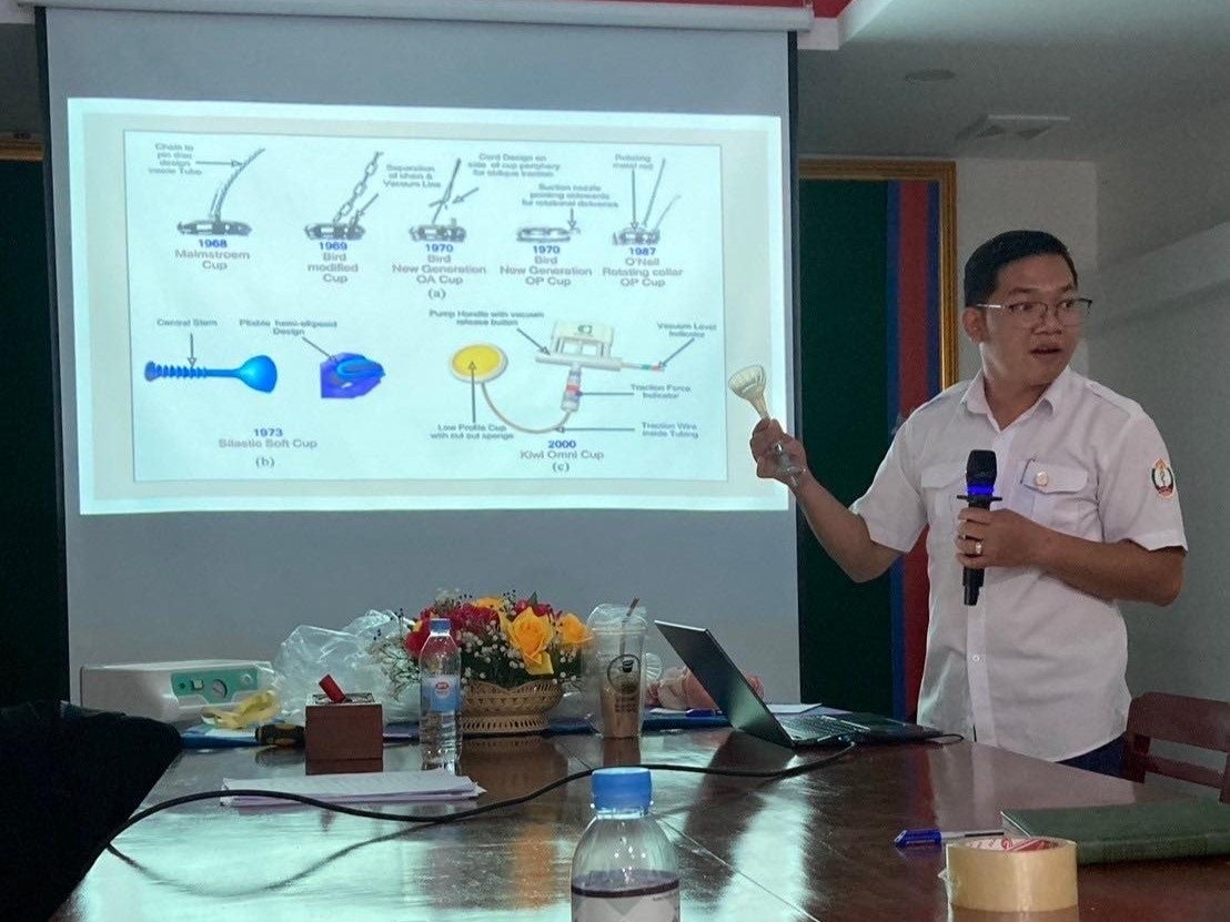 トレーニング用の新生児のマネキンを使用し、実際の吸引圧のかけ方、圧の抜き方を体験しながら吸引分娩のデモンストレーションを行いました。また、パワーポイントや動画でも、吸引分娩器についての説明が行われました。機器の使用法だけでなく、病院の医師によるガイドラインに沿った吸引分娩について講義も行われました。