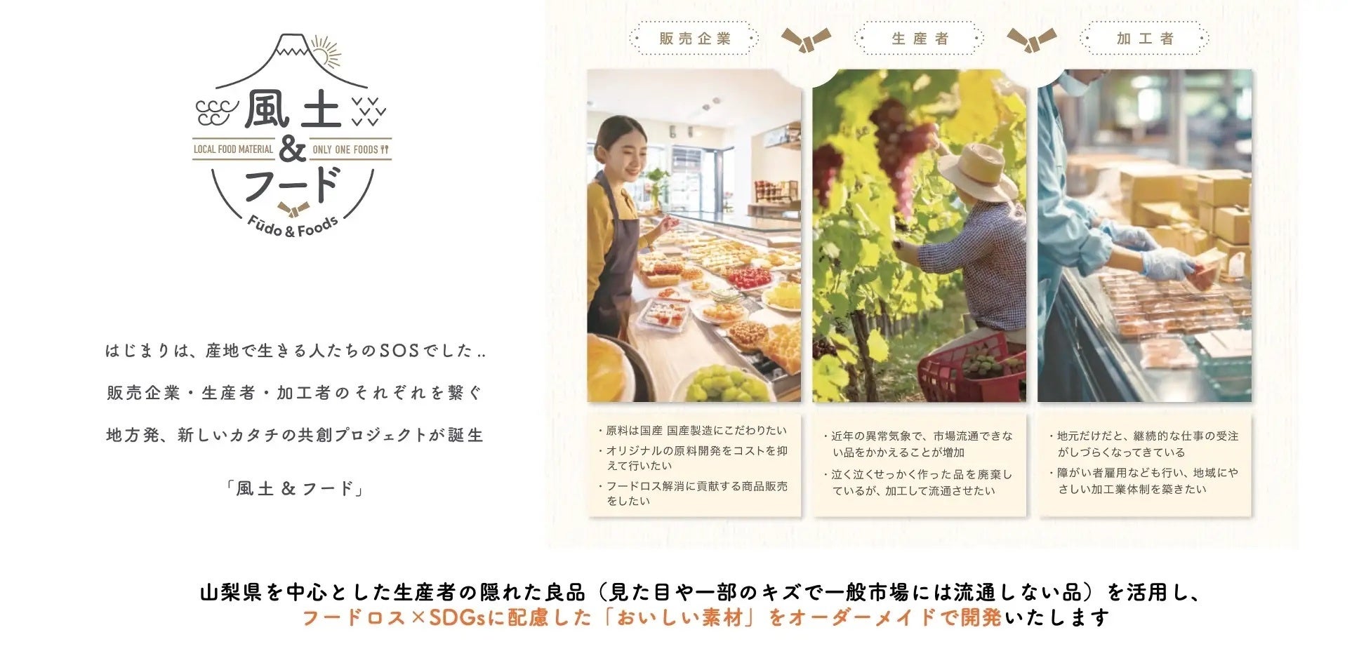 山梨県にある創業80年を迎える包装資材商社「株式会社オオキ」様の新規事業を支援しています。全国の生産者・加工者を募り、アップサイクル×オーダーメイドなSDGs商品開発を行う「風土&フード」プロジェクトの営業やPR戦略、また営業・PR実行を行い、事業拡大を推進しています。