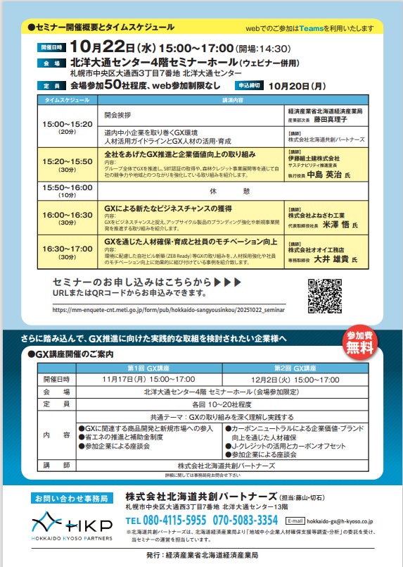 株式会社北海道共創パートナーズ(本社:札幌市、代表取締役社長:岩崎 俊一郎)は経済産業省北海道経済産業局の委託を受け、令和7年度北海道経済産業局における地域中小企業人材確保支援等・分析【事業区分F】の一環として、中小企業が抱えるGX(グリーントランスフォーメーション)に関する課題解決をテーマとしたセミナーの企画運営を行う事となりました。