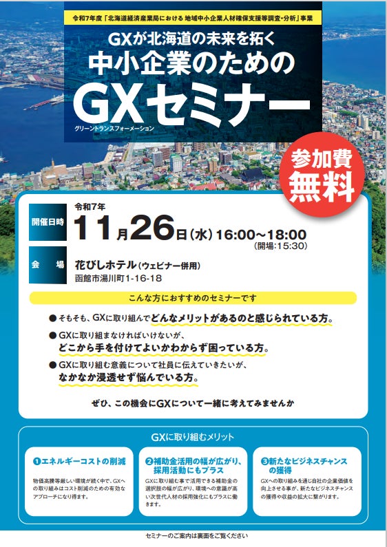 中小企業がGXに取り組む意義の他、GXに取り組むことで人材確保や新規顧客の開拓、企業ブランドの向上に繋がった具体的な事例等を紹介することで、GXへの理解を深め、実践を後押しすることを目的に、札幌と函館でそれぞれ開催致します(参加無料)。