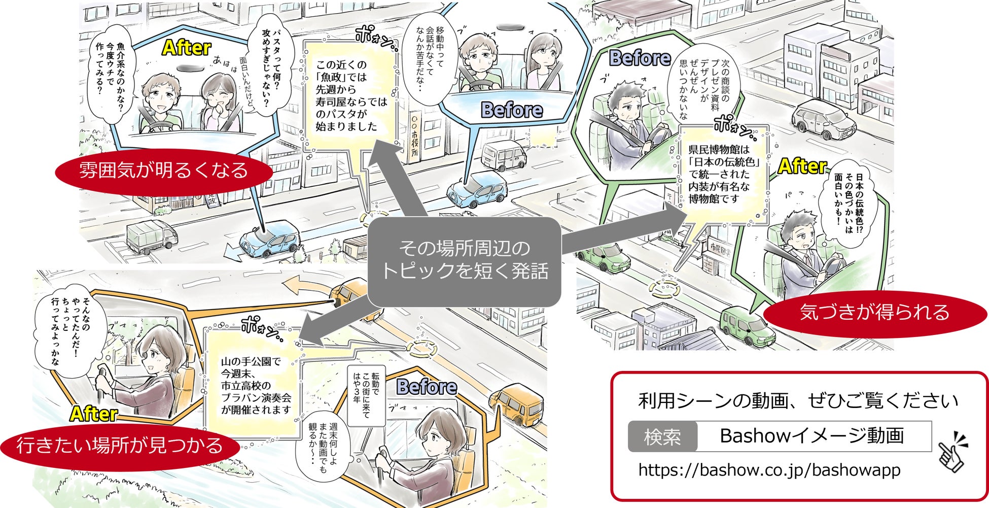 当社Bashowは、2030年代には20兆円規模といわれる車載アプリ市場の基盤システム構築を目指し、まずは車載アプリの先駆けとなるサービスを、当面はスマホアプリとして運用する取組みを開始しています。クルマなどで移動中の人に、その場所周辺のトピックを音声で短く案内するサービスで、その地域の魅力に気づいたり、関心や行動の幅が広がるという価値を利用者に提供します。デジタルコンテンツによって、移動体験を豊かで価値あるものに変えていきます。