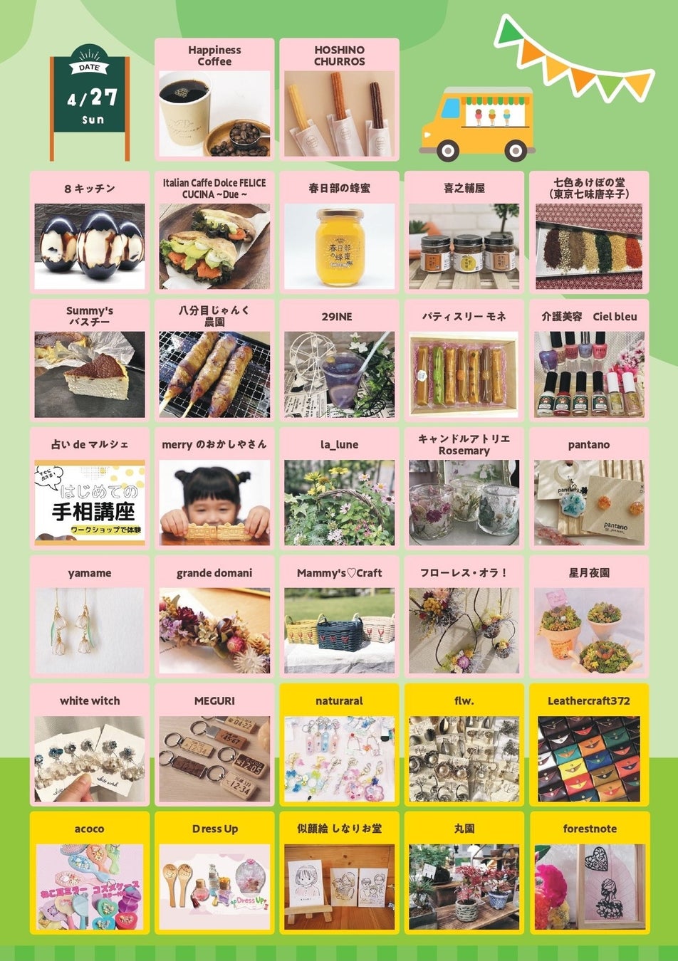 (キッチンカー8台、フード12店舗、クラフト23店舗、ワークショップ9店舗、その他5店舗)