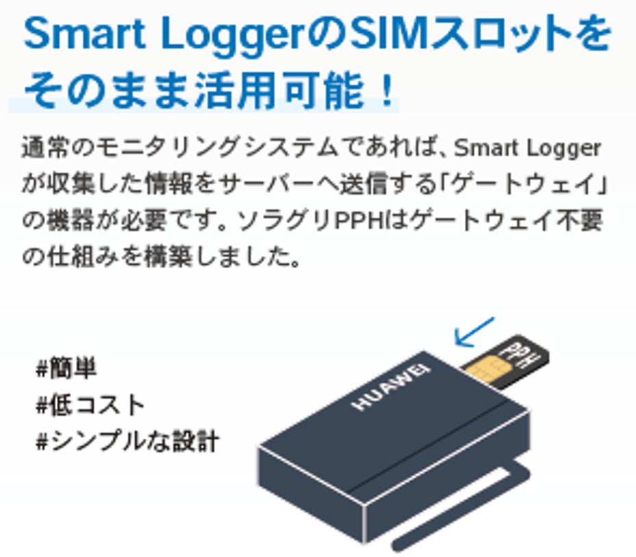 ファーウェイ社製のパワコンの場合に、通常のモニタリングシステムに必要な「ゲートウェイ」を不要とし、Smart LoggerのSIMスロットをそのまま活用可能な仕組みを構築しています。